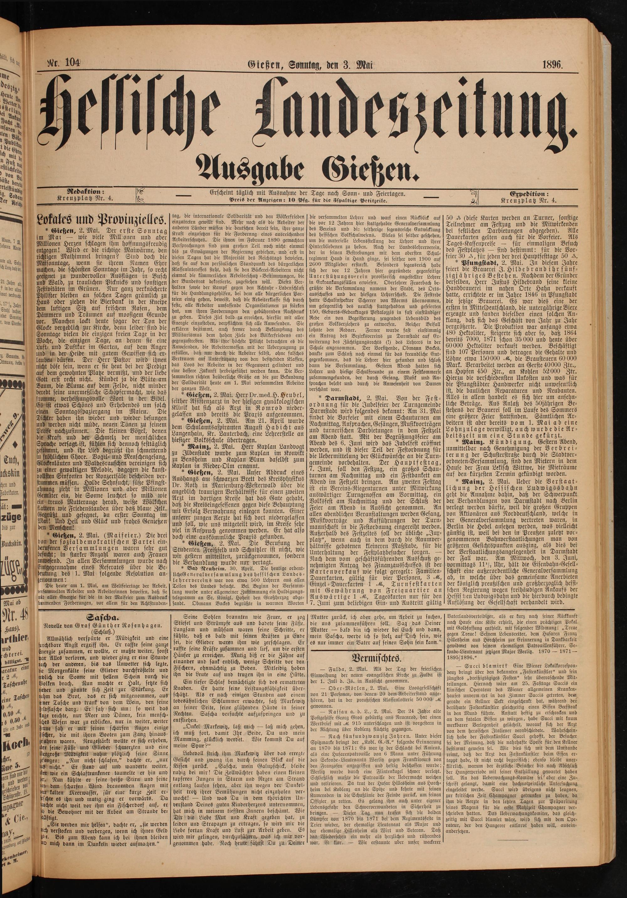1 7 2 7 2 9 0 5 77 5 5 5 N 788. Erscheint täglich mit Ausnahme der Tage nach Sonn- und Feiertagen. N Expedition: der Reih— U. 8 8 Preis der Anzeigen: 10 Pfg. für die Sspaltige Petitzeile. 20 Kreuzplatz Nr. 4. 1 — 195 7 7 tag, die internationale Solidarität und den Völkerfrieden] die versammelten Lehrer und warf einen Rückblick auf] 50„(diese Karten werden an Turner, sonstige 0 Lokales und Provinzielles. 1 gewillt sind. Mehr noch als die Arbeiter der die vor 12 Jahren hier stattgehabte Generalversammlung Ane am Festzug und die Mitwirkenden Gießen, 2. Mai. Der erste Son tag 25 155 änder müssen 805 8 bereit fein ihre ganze des Vereins und die seitherige segensreiche Entwicklung bei festlichen Darbietungen abgegeben). Alle i Mat— wie viele Millonen und aber Kraft einzusetzen für die Forderung eines ausreichenden] des hessischen Volkschulwesens. Vieles sei seither geschehen, Dauerkarten gelten auch für die Vorfeier. Als Mam, 1 5 Arbeiterschutzes. Die ihnen im Februar 1890 gemachten] um die materielle Lebensstellung der Lehrer und ihrer f N