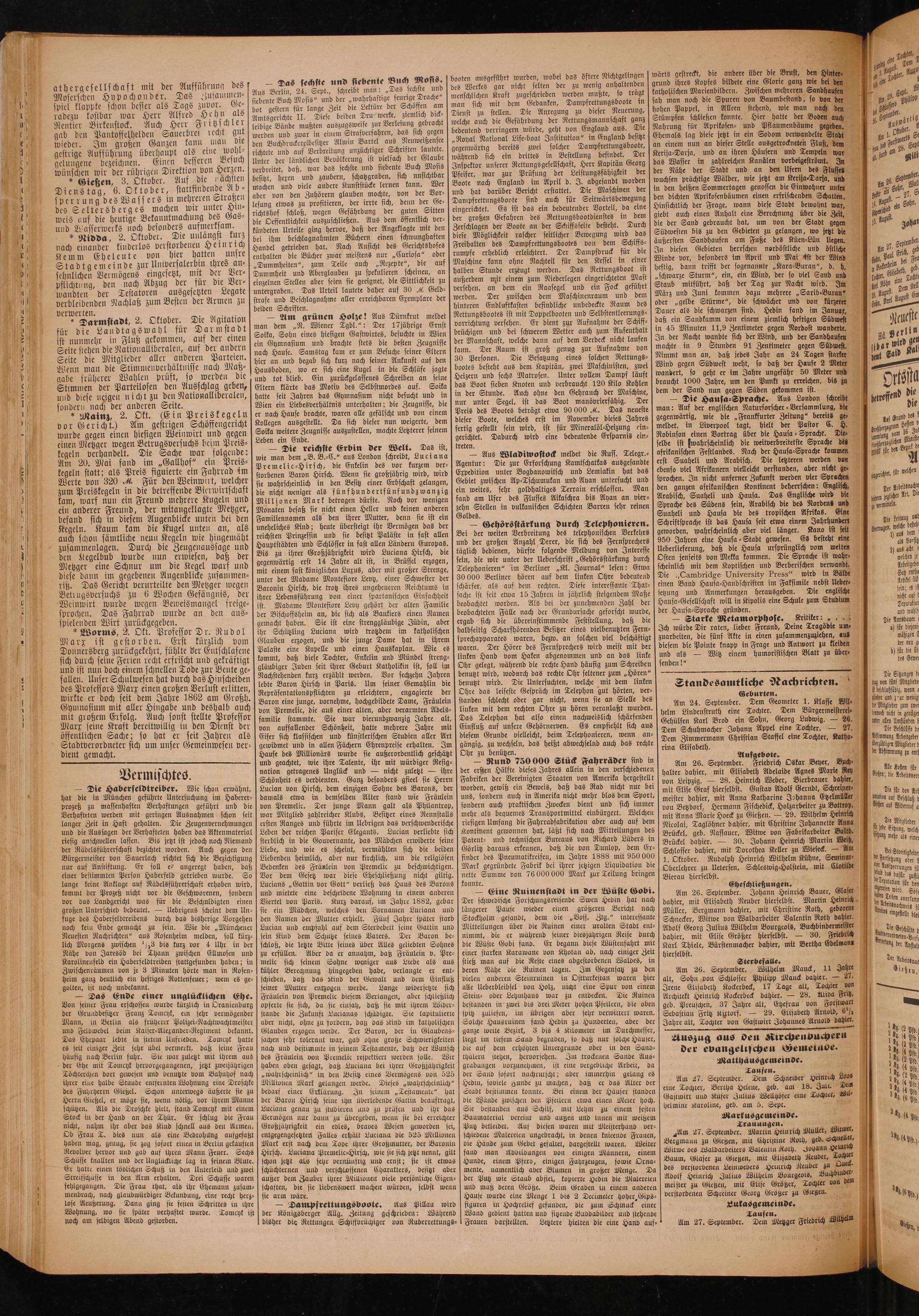 Standesamtliche Nachrichten. Geburten. 1 Am 24. September. Dem Geometer 1. Klasse Wll⸗ helm Lindenstruth eine Tochter. Dem Bürgermeisterel⸗ Gehülfen Karl Brod ein Sohn, Georg Ludwig.— 7 Dem Schuhmacher Johann Appel eine Tochter.— 27. Dem Zimmermann Christian Staffel eine Tochter, Katha⸗
