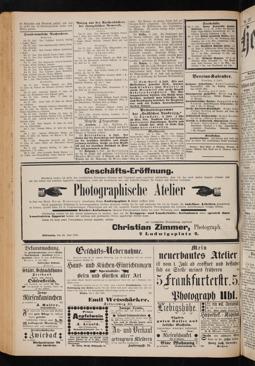 g 5 N i 5 rufen. l N 5 die Rheinallee nach Mombach geführt und 11 Auszug aus den eee Straßen Arbeit aufgeboten. Die Staatsbahnen Sterbefälle. N da zurück über die Mombacherstraße wieder nach der evangelisehen 19 5 e. verweigern die Beförderung von Teilnehmern Am 2. Juli. Anna Franziska Sophie„ Malnz geleitet. Math ge mee e der Meetings. Es werden infolge dessen ernste Asprion, 1/ J. alk, Tochter von Brauerei. f e tian Be Konflikte befürchtet. besitzer Eugen Asprion, Bahnhofstraße 20. Be⸗ Standesamtliche Nachrichten. Den 28. Juni. Dem e 5 95 Bepper⸗ 1 Sofia, 4. Juli. Die Nachrichten von erdigung Sonntag Nachmittag é Uhr. Geburten. ling 1 9 n de cen Decker der Grenze bestätigen, daß die bulgarischen Be⸗! Am 2. Juli. Viktor Friedrich Recker, 20 J. den Taals Friedrich Dietrich t e. j hörd n die Bildung von Räuber⸗ alt, Unteroffizier 8/116. Die Beerdigung findet f. 1 Lacter, Minna Elistbelh Johanna Marie, geb. den 15 10 12 gisch einschre Fortgesetzt Samstag, den 5. ds. Mts., nachmittags 5 Uhr, 1 Tochter, Marie. 8 un anden energis i 1 gesetz 5 ds.„ 5 f Am 22. Juni. Dem Schneidermeister Ludwig Simon 8. Jin Beerdigte. werden Waffen mit Beschlag belegt und verdäch⸗ vom Garnisonlaßarett aus ftatt. 0 S 1. ö eite ber 5 ß 95 l b Am 3. Juli. Gottfried Philipp Zinn, 1. 0 1 Sohn, Heinrich. 5 5. Den 28. Juni. Johann Klein, Metzgermeister, ver- tige Personen verhaftet. Eine große Zahl von 11, Sohn b. Gilfsbremsr Ada N Am 24. Juni. Dem Commis Wilhelm Frohnhäuser heiratet, 54 Jahre alt, starb den 26. Juni. militärischen Emigranten aus Rußland wird e 2 die Benden Suni 1 Sohn. 5. Juni. Dem Schlosser Theodor Tschan 1 Sohn. Marcusgemeinde. demnächst erwartet. Sämtliche Blätter, mit den 5. ds. Mts., vormittags 11 Uhr, bon An 27. Juni. Dem Taglähner Georg Prinz Tochter, eee. 5 Ausnahme der Swoboda, welche energisch gegen Sterbehause aus statt. r 5 f Den 30. Juni. Karoline Schwalb geb, Wick, Ger die Einstellung von Emigranten in die Armee] Am 3. Juil. Wilhelm Wagner, 29 J. al, ee e, Jun. Den Scuhnacher Heini Gelmer fle. ga e, e Schwalb, 72 Jahre protestiert, ignorieren die Emigrantenfrage. D Schneider dahier, Rittergasse 19. Die Beerdl⸗ 1 Tochter, Bertha Clisabeth Johanna. 8. 0 2 de Hd. Athen, 4. Juli. Aus Kane Fial gung findet e 5. ds. Mts., vor⸗ Am 28. Juni. Dem Schlosser Heinrich Babel 1 Toter. Danf gemeldet, daß der neue Gouver neur überall, mittags 9 Uhr, vom Sterbehause aus statt. 9. Juni. Dem Schneider Otto Steig 1 Sohn. ger Seen besonders von den Türken mit großer Kälte Am 29. Juni. Dem Schnee 5 ister Den 28. Juni. Dem Former Ludwig Ott 1 Sohn, 8 Am 29. Juni. Dem Taglöhuer Franz Rentmeister 1 5 0 12 15 18. Aich 5 aufgenommen wird. Trotz den 1 we L 1 Sohn, Leonhard Heinrich Theodor Wilhelm. e ee Dein Postscheffer Mi S., der Abgeordneten ist es doch noch zweifelhaft, 8 Nba 10 1 Sl e e e b e e e ob es 5 Eröffnung der National-Versammlung Vereins⸗Kalender. 1 grenzt Am 1. Juli. Dem Ofensetzer Martin Melche e 1715 167 5 8 5 B Sterbefälle: Sihebeih Gbridten deb. ben. a 1 h New⸗PYork, 4. Juli. Wie aus Sam stag, 4. Juli: 1— Am 27. Juni. Karoline Schwalb, geb., Wich 5 Beerdigte. Milkesbarre gemeldet wird, wurden Gießener Zitherkranz: Familienabend n 72 Jahre alt, Ehefrau von Privatier Hermann Schwalb Den 30. Juni Ludwig Babel, Privatmann, 77 J.] durch Einsturz einer Gallerie in Vereinslokale. Liste für Ausflug Staufenbeg 186 dahier. 1 7 85 5 alt, starb den 25. Juni. einem Bergwerk eine große Anzahl liegt daselbst offen. 0 765 Am 28. Juni. Katharina Schmehl, 10 Jahre alt, Johannes gemeinde. Arbeiter verschüttet. Die Ret⸗ Sonntag, den 5. Juli: L rdors de⸗ Tochter von Straßenkehrer Karl Hchmehl 11 t Trauungen. tungsarbeiten dürften eine Woche bean- Gesangverein Heiterkeit: Partie nach Wil, g 3 l Stein Am 90 Juni. Ludwig Babel, 77 Jahre alt, Den 28. Juni. Friedrich Wilhelm August Kalesky, spruchen, weshalb man befürchtet, daß 19 me Abfahrt Morgens 4 Uh n bed statt Privatier dahier. 5 a 9 Schmied zu Gießen und Elisabeth Wilhelmine Rinn, T. 1 5 an fahr Am 28. Juni. Franz Tölle, 43 Jahre alt, Maurer 950 ee 8 Geben nach e 1 1 Kaufmännischer Verein: Sommerfest in Baß sik. 95 von Fürstenau. 5 1 Beerdigte. nur noch als Leichen Nauheim.(Hotel⸗Restaurant Wilhelmshöhe). Ab. en del 1 Am 28. Juni. Elisabethe Katharine Kinzenbach, geb. Den 30. Juni. Katharine Schmehl, Tochter des werden können. fahrt 2 Uhr 18 Minuten. 41 Gesongbereile Keil, 28 Jahre alt, Ehefrau von Landwirt Balthaser Straßenkehrers Karl Schmehl, 10 Jahre alt, starb den Privattelegramme Große Karneval⸗Gesellschaft: Großer hum a bon Merl, 0 Gustav Kinzenbach zu Oppenrod. Sin n e 5 4 ristischer Ausflug mit Konzert und Tanz n deb dem sich 00 Am 29. Juni. Dorothea e. 28 05 Den 2. Juli. Heinrich Kreiling, Taglöhner, 86 J. der„Hessischen Landesztg.„Stadt Marburg.“ ö 6 sole. Vol Ehefrau von Landwirt Philipp Kreiling VIII. zu Wieseck. alt, starb den 30. Juni. Hd. Darmstadt, 4. Juli. 1 uhr Festverband Gießen⸗Lahr: Groß es Sommer, u dtn 0 Am 30. Juni. Heinrich Kreiling II., 86 Jahre alt,— 20 Min. Nm Nachdem das russische fest auf der„Schönen An sstchl.“ 9 100 0 Privatier dahier. Neue ste Telegramme 5 5 5 r Kopenhagen, Berlin und Deutsch⸗ u. Oesterreich. Alpenverein(Seltio g ien Am 1. Jul. Peter Schmidt, 38 Jahre alt, Land⸗ Juli izekönig Li Kaiserpaar Feen, S Gießen): Sektions Tour Gießen—Elimbach⸗ bl ebnen wirt von Oberfichbach. e ee 0 Wien besucht hat, 5211 es Ende Sen: Aszpentippel--Allendorf d. d. ba.—Leydenhöferte h Man 110 Juli. Clemens Schlun, 44 Jahre alt, Agent. Hung-Tschang wird am 3, August aus Paris tember hier eintreffen. Ae d. Eda. 5 magnd want 1 hier eintreffen und einen Aufenthalt von einem Fortbach— Staufenberg. Abmarsch: Walli aug