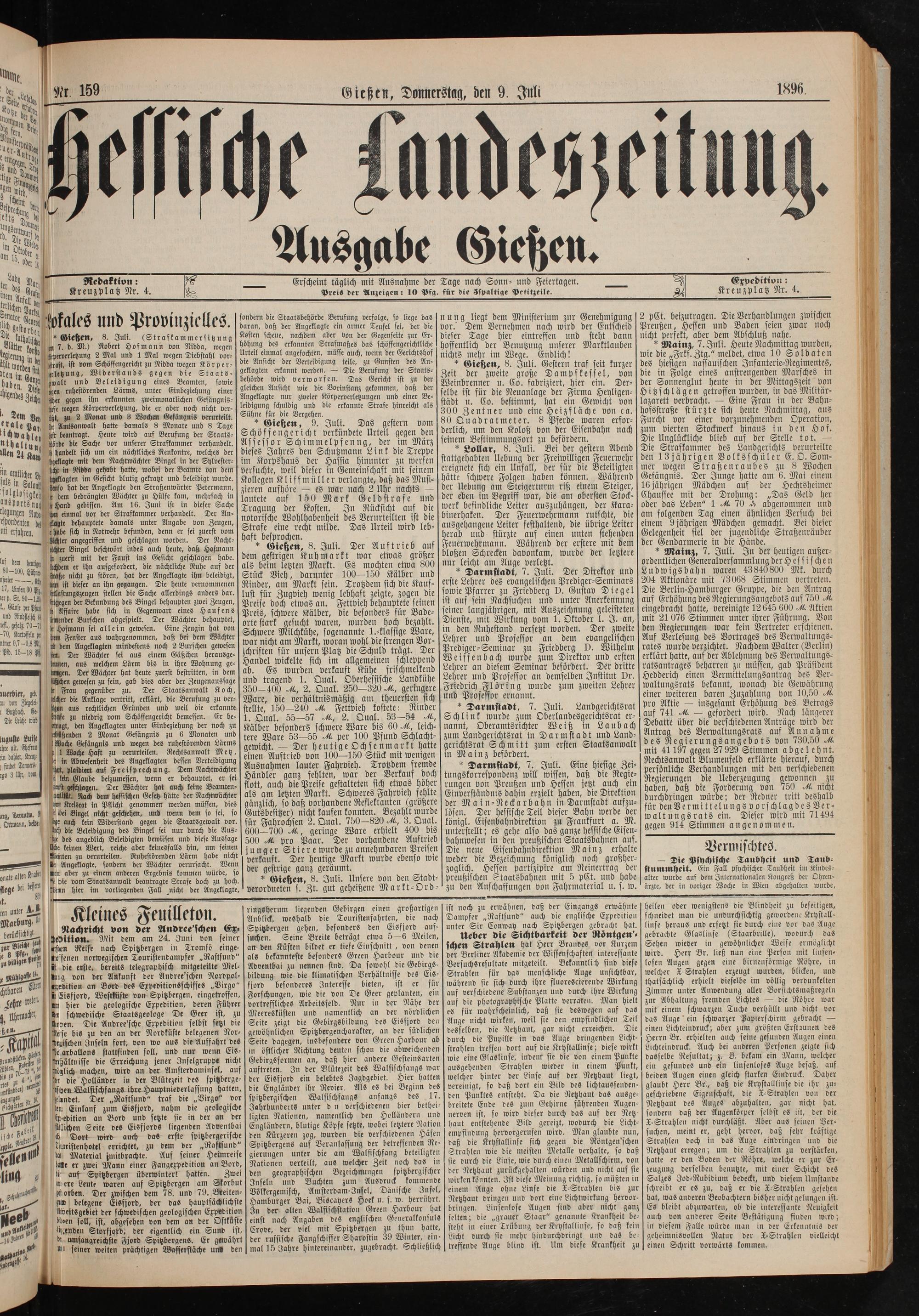 * Gießen, 8. Juli. Gestern traf seit kurzer Zeit der zweite große Dampfkessel, von Weinbrenner u. Co. fabriziert, hier ein. Der⸗ selbe ist für die Neuanlage der Firma Heyligen— städt u. Co. bestimmt, hat ein Gewicht von 300 Zentner und eine Heizfläche von ca. 80 Quadratmeter. 8 Pferde waren erfor⸗ derlich, um den Koloß von der Eisenbahn nach seinem Bestimmungsort zu befördern. Lollar, 8. Juli. Bei der gestern Abend stattgehabten Uebung der Freiwilligen Feuerwehr ereignete sich ein Unfall, der für die Beteiligten hätte schwere Folgen haben können. Während der Uebung am Steigerturm riß einem Steiger, der eben im Begriff war, die am obersten Stock⸗ werk befindliche Leiter auszuhängen, der Kara⸗ binerhaken. Der Feuerwehrmann rutschte, die ausgehangene Leiter festhaltend, die übrige Leiter herab und stürzte auf einen unten stehenden Feuerwehrmann. Während der erstere mit dem bloßen Schrecken davonkam, wurde der letztere nur leicht am Auge verletzt. * Darmstadt, 7. Juli. Der Direktor und erste Lehrer des evangelischen Prediger-Seminars sowie Pfarrer zu Friedberg D. Gustav Diegel ist auf sein Nachsuchen und unter Anerkennung seiner langjährigen, mit Auszeichnung geleisteten Dienste, mit Wirkung vom 1. Oktober l. J. an, in den Ruhestand versetzt worden. Der zweite Lehrer und Professor an dem evangelischen Prediger-Semiuar zu Friedberg D. Wilhelm Weiffenbach wurde zum Direktor und ersten Lehrer an diesem Seminar befördert. Der dritte Lehrer und Professor an demselben Institut Dr. Friedrich Flöring wurde zum zweiten Lehrer und Professor ernannt.