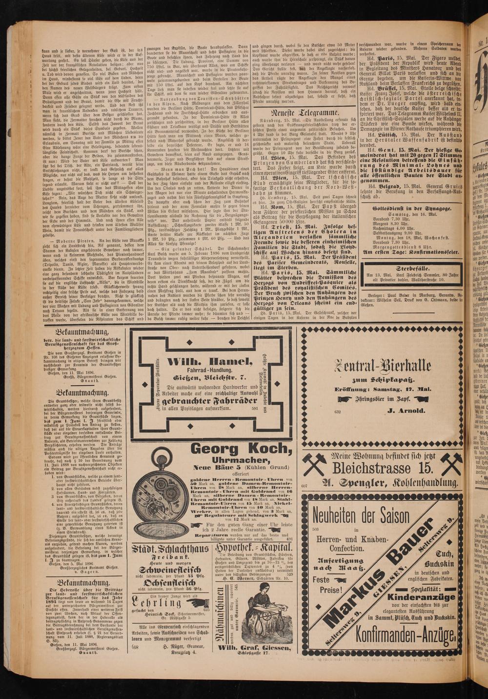 Mögliche, nur nicht auf das, was die Herzen am heißesten Gasthofes in Weimar hatte einem Gaste das Gepäck nach 0 5 ö fragen, er dehnt die Mahlzeit, so ae es die Sitte dem Bahnhof befördert, aber sein Trintgeld nicht erhalten, Hd. Wien, 15. Mai. Der tschechische alle öffentlichen Bauten der Stadt an⸗„Gleßen 3 0 e den 1 0 e 17755 117 da der Zug schon einfuhr und der Reisende eiligst einstieg. Klub ermächtigte seine Mitglieder, für die so⸗ genommen. 1 Josebel iebste ungetröstet fort, soll ihm ittagessen ohne] Um den Ob e 85 0 5 3585 5 N 1 1 Hosenb e, Nor b⸗Weff⸗ ma ene ee ee e 1 ge; 5 0 ö 8 s nur eine Minute anhaltenden Harmonika⸗[ bahn zu stimmen. lehnte die Berufung in den Verfassungs-Aus⸗ 0 J. I. sohn?“ Nein, das Auge der Mutter fleht nicht umsonst. zuges und nahm hier sein Fünfzigpfennigstück in Empfang. Hd. Lemberg, 15. Mai. Seit zwei Tagen schneit schuß ab 9 s- 0 8 Langsam, feierlich holt der Vater den ältesten Käseleib[Da dampfte aber auch schon der Zug zum Bahnhof es hier. In ganz Ost⸗Galizien herrscht empfindliche Kälte b 8 1 1 des Hauses hernieder vom Schragen, zertrümmert ihn, hinaus und der arme Fomulus mußte so gegen seinen Hd Rom, 15 Mai Der Pap st über 111 0 Aae 0 reicht dem Burschen und dem Mädchen ein Stück, und Willen bis Erfurt mitfahren. Hier legte ihm der Sta⸗ e e e Ji 9 Gottesdienst in der Syna ate 1 wie sie gegessen haben, sind sie Verlobte vor den Gewalten tionsbeamte alsbald die Rechnung für die„Vergnügungs⸗ dem Führer der priesterlichen Mission zu Schoa Same g del 10 5 1 goge. N og der Erde und des Himmels. Und nach ihnen essen Alle reise“ vor. Das unheilvolle Papier enthielt folgende als Beitrag 50000 Verpflegung der italienischen Vorabend 7.30 Uhr. 1 HGiießen vom ehrwürdigen Käse und trinken vom ältesten Walliser] Aufstellung:„Schnellzugskarte zweiter Klasse 1 Mk. 50 Gefangenen 50 000 Lire. 1 5 Morgens 8.30 Uhr. N 119 Wein, damit die Freundschaft unter den Familiengliedern] Pfg., tarifmäßiger Zuschlag 1 Mk., Platzgebühr 1 Mk., Hd. Triest, 15. Mai. Infolge hef⸗ Nachmittags 4.00 Uhr Ghee gedeihe. Karte dritter Klasse zur Rückfahrt im nächsten Zuge tigen Auftretens der Cholera in Sabbathausgang 9.00 Uhr. 1 0 et, um — Moderne Piraten. An der Küste von Marokko] 1 Mk. 10 Pfg., zusammen 4 Mk. 60 Pfg.— Und das Alexandrien verlassen sämmtliche Montag, den 18, Mal, Woche nfest 1 0 zieht sich ein Landstrich hin, Rif genannt, dessen dem Alles für fünfzig Pfennige! Fremde sowie die besseren einheimischen Vorabend 7.30 Uhr. 5 lie Stamm der Kabylen angehörende Bewohner noch immer,— Ein gesunder Schädel. Der Schuhmacher Familien die Stadt, sodaß die Lloyd⸗ Morgengottesdienst 8 Uhr. 5 1 00 iche wenn auch in kleinerem Maßstabe, das Piratenhandwerk Karl Busch wurde am 5. Februar 1896 vom Landgericht schisfe auf Wochen hiuaus besetzt sind. Am ersten Tage: Konfirmationsfeier 1. 1 üben, welches einst den sogenannten Varbareskenstaaten Traunstein wegen fahrlässiger Körperverletzung verurtheilt. Hd. Paris, 15. Mai. Der Präsident ben fe (Tripolis, Tunis, Algier, Marokko) als Haupterwerbs⸗] Er kam eines Abends mit seinem Veloziped auf der Land⸗[des Pariser Gemeinderats, Rouselle 1 ian weder. quelle diente. In letzter Zeit haben die Rifkabylen wieder straße von Ober- nach Untertheißendorf gefahren, wobei liegt im Sterben. 5. 9 ö Gießen eine ganz besonders lebhafte Thätigkeit im Ausplündern er das Wirthshaus„Zum Moosbad“ passiren mußte. Hd Paris 15. Mai Sämmtliche Sterbefälle. Scwürger vorbeipassierender Schiffe entwickelt. Vor kurzem feuerten Dort hielten zwei mit Pferden bespannte Wagen, auf 3445 80 0 2 77 Am 13. Mai. Karl Friedrich Sem Hethand sie auf die englische Lustyacht„Ailsa“, die in Windstille deren erstem ein Dienstknecht saß, der die Zügel um die Se 4 die e des alt Privatier 11155 1 e 1 0 1 halle in der Nähe der Küste trieb. Glücklicherweise sprang] rechte Hand geschlungen hatte, während er mit der linken Kerzeg on Audriffret⸗Pa quier als 0 0 U Mi rechtzeitig eine frische Prise auf, welche das Fahrzeug bald einen Maßkrug hielt, aus dem er trank. Bei dem Heran⸗ Präsident des royalistischen Comités. 0 g saslch außer Bereich seiner Verfolger brachte. Nicht so glücklich nahen des Radlers wurden die Pferde schon sehr unruhig Der Bruch zwischen den Anhängern des* 8 1 u 1 gl ist die britische Felnke„San Jose“ davongekommen, welche und drängten nach der linken Seite hinüber, so daß sowohl Prinzen Henry und den Anhängern des 5 11 Paul Bader in Marburg, Verantw. N⸗ 0 nil vor vier Wochen mit Ladung und Passagieren von Gibraltar] der Kutscher als auch die Wirthin ihm zuriefen, er solle Herzogs von Orleans scheint ein end⸗ 1 ilhelm Sell, Druck von E. Ottmann, beide in 14 Hichet nach Tetuan segelte. Als sie in einer Entfernung von doch halten. Da er das nicht befolgte, steigerte sich die gültiger zu sein. Gießen. 1 Haltet drei Meile von der afrikanische Küste von Windstille be⸗ Unruhe der Pferde immer mehr; sie bäumten sich und— Hd. Paris, 15. Mai. Der Geldschrank, welcher vor 1 f bel troffen wurde, überfielen die Rifpiraten das Schiff und] da Busch immer ruhig weiter fuhr— brachen die Deichsel] einigen Tagen in der Kaserne in der Rue de Babylon 1 en Nufzieh ———— 9—=———— 3—— I Husices br 9 8 epo Bekanntmachung, 46%%%%%%%%%%%%%%%%%%%%%, e betr. die land⸗ und forstwirtschaftliche— 2 l. Die Lei Berufsgenossenschaft für das Groß⸗ 0 0 2 Ahe geh herzogtum Hessen. 5 ö gieße Die vom Großbherzogl. Kreisamt Gießen in 5 Nr. 108 des e 15 1 5 erlassene Be⸗= 0 1051 1 kanntmachung in obigem Betreff bringen wir 2 2 2. e in 1 5 zur Keuntnis der Grundbesitzer— Wilh. Hamel.— 3 2 1 85 lc un iesiger Gemarkung.— 8— N Gießen, 55 8 Fahrrad- Handlung, 25* ont A 5 ler 4 b. 5 95 roßh. Bürgermeisterei Gießen. 8 2 2 8 2 rd.) Gef f Gb. 4 85 Gießen, Bleichstr. 7. 8 3 zum Sehipkapaßz lb der dal — 2* l B f t Die auswärts wohnenden