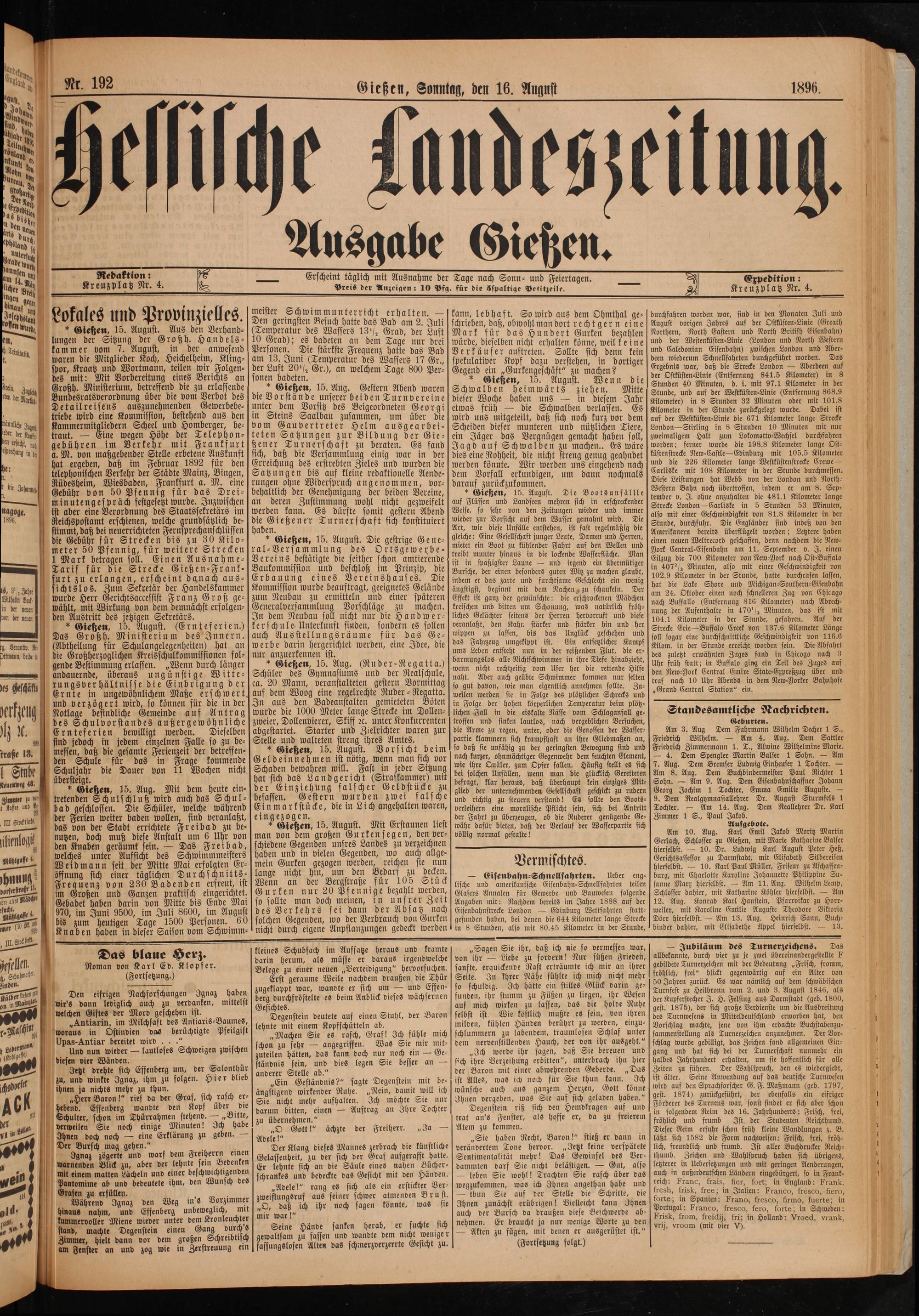 Am 10. Aug. Karl Emil Jakob Moritz Martin Gerlach, Schlosser zu Gießen, mit Marie Katharine Balser hierselbst.— 10. Dr. Ludwig Karl August Peter Heß, Gerichtsassessor zu Darmstadt, mit Elisabeth Silbereisen hierselbst.— 10. Karl Paul Müller, Friseur zu Aschaffen⸗ burg, mit Charlotte Karoline Johannette Philippine Su⸗ sanne Marx hierselbst.— Am 11. Aug. Wilhelm Lemp, Schlosser dahier, mit Katharine Köhler hierselbst.— Am 12. Aug. Konrad Karl Hanstein, Pfarrvikar zu Horr⸗ weiler, mit Karoline Emilie Auguste Theodore Viktoria Dörr hierselbst.— Am 13. Aug. Heinrich Sann, Buch⸗ binder dahier, mit Elisabethe Appel hierselbst.— 13.