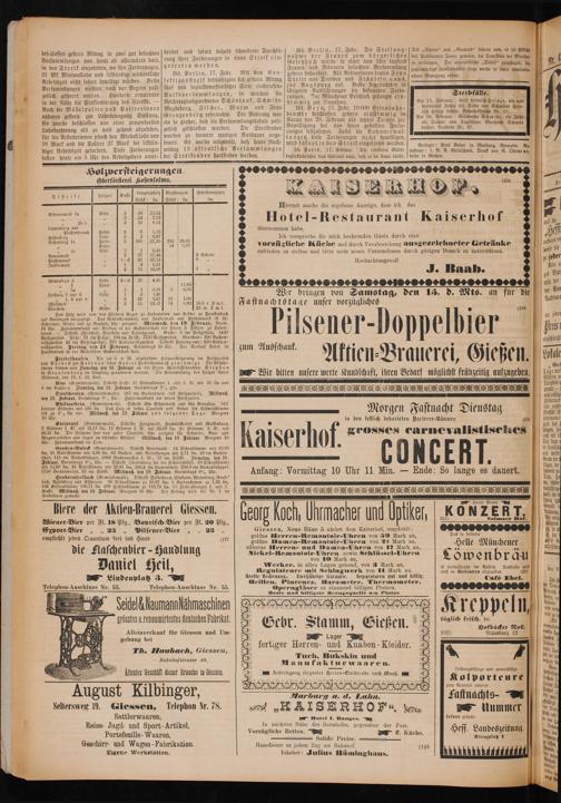 —.— D—————————— —. 2 Holzversteigerungen. Sessel Oberförsterei Hohensolms. 80 8 1 8 8 1 1 rr Holzart Klasse Langnutzbolz] Nutzstangen Schichtnutzholz A 4 n 2 8 8 J K 5 luck! u Std! dn an a i e NI Hiermit mache die ergebene Anzeige, dass ich das Scheuerwald 1a Eiche 2 28 29,52 II 5 1 R K 2 1 e eee, otel- Restaurant alserhof Lappenberg und i 5 übernommen habe Pfaffenstrauch Fichte 2 6 5,33 8 ö 5 4 e Eiche 2 155 7 81 5 23 50 Ich verspreche die mich beehrenden Gäste durch eine iches berg l. Fichte 5 27,15 252 23 85„oz iii 5 5 i ausges ö 1 en 1 Fieser 5 8 54 5,87 vorzügliche Küche und durch Verabreichung ausgezeichneter Getränke . Eiche 5 140049. zufrieden zu stellen und bitte mein neues Unternehmen durch gütigen Besuch zu unterstützen. Annenwald 1 2 17 17,48 2 Scheite 1„ 1 455 25 1 S Hochachtungsvoll unkerwa 7 57 211 14,98 1 J. Baab 0 0 Windelbach 3 Eiche 2-3 27 8445 T sss 3 1 5a 1*„ 5„35„ 1 5 N N babe p dus eh,„ 45 10 Wir bringen von Samstag, den 15. d. Mts. an für die 5 3 nd 8 2 26 3,67 3 N 5„ 1 Ahe.„„ e e ess en, Fastnachtstage unser vorzügliches Eberstein Kiefer 22 rd. 2 ml.