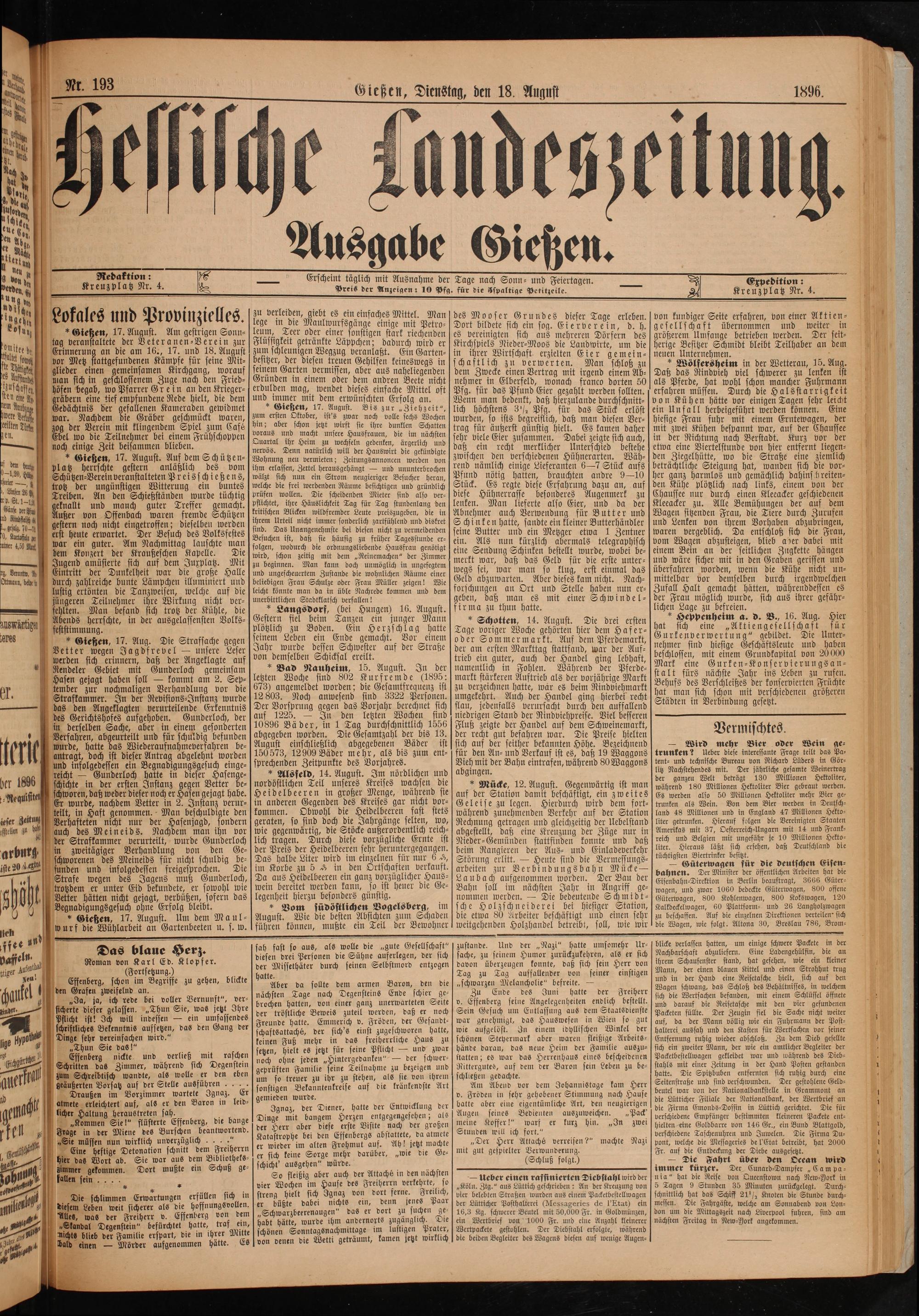 * Bad Nauheim, 15. August. In der letzten Woche sind 802 Kurfremde(1895: 673) angemeldet worden; die Gesamtfrequenz ist 12803. Noch anwesend sind 3322 Personen. Der Vorsprung gegen das Vorjahr berechnet sich auf 1225.— In den letzten Wochen sind 10896 Bäder, in 1 Tag durchschnittlich 1556 abgegeben worden. Die Gesamtzahl der bis 13. August einschließlich abgegebenen Bäder ist 150573, 12909 Bäder mehr, als bis zum ent⸗ sprechenden Zeitpunkte des Vorjahres.