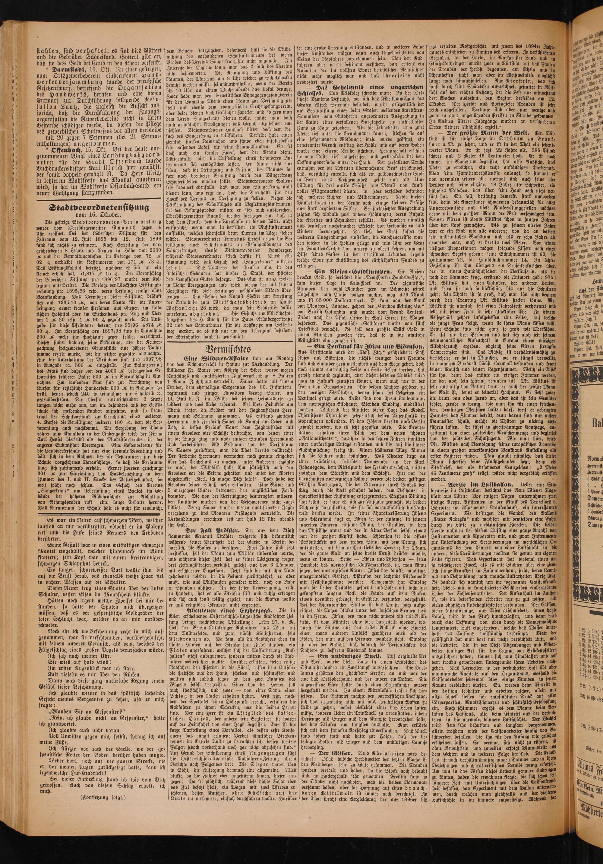 — Der größte Mann der Welt. Mr. Wil⸗ kins ist für einige Tage im Orpheum zu Frank⸗ furt a. M. zu sehen, und er ist in der That ein sehens⸗ werter Mann. Er ist jetzt 22 Jahre alt, 386 Pfund schwer und 2 Meter 46 Centimeter hoch. Er ist noch immer im Wachstum begriffen, hat also Aussicht, drei Meter zu erreichen, ein recht anständiges Gardemaß.