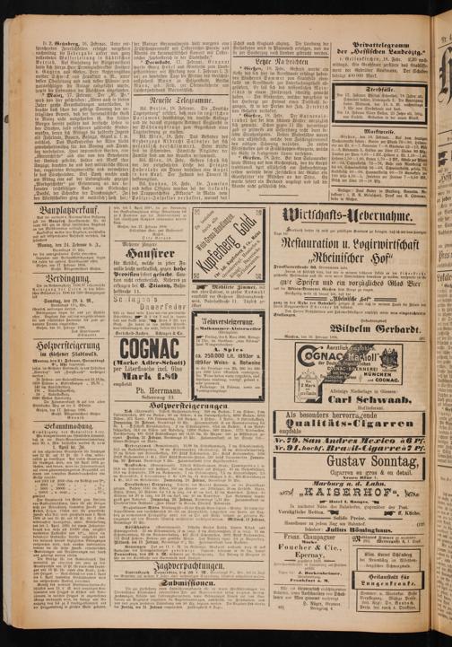 Overförsterei Ortenberg. Distrikte des Reviers Seemann, an der Staatsstraßze gelegen. Buchen: 1137 rm Scheit, 550 xm Stamm und Astknüppel, 20 xm Erdstöcke. Aborn, Eschen, Ulmen, 50 Stämme bis 8,4 m lang, bis 40 em stark, 42 rm Rundscheit. Fichten: 30 Stämme bis 20 m lang, bis 33 em stark, und 20 xm Rundscheit Das Buchenholz kommt zuerst zum Ausgebot. Donnerstag, 20. Februar, Vormittags ½11 Uhr. Zusammenkunft im Oberheim'schen Gasthause„Zum Löwen“ in Gedern, Oberhess. Nebenbahn.