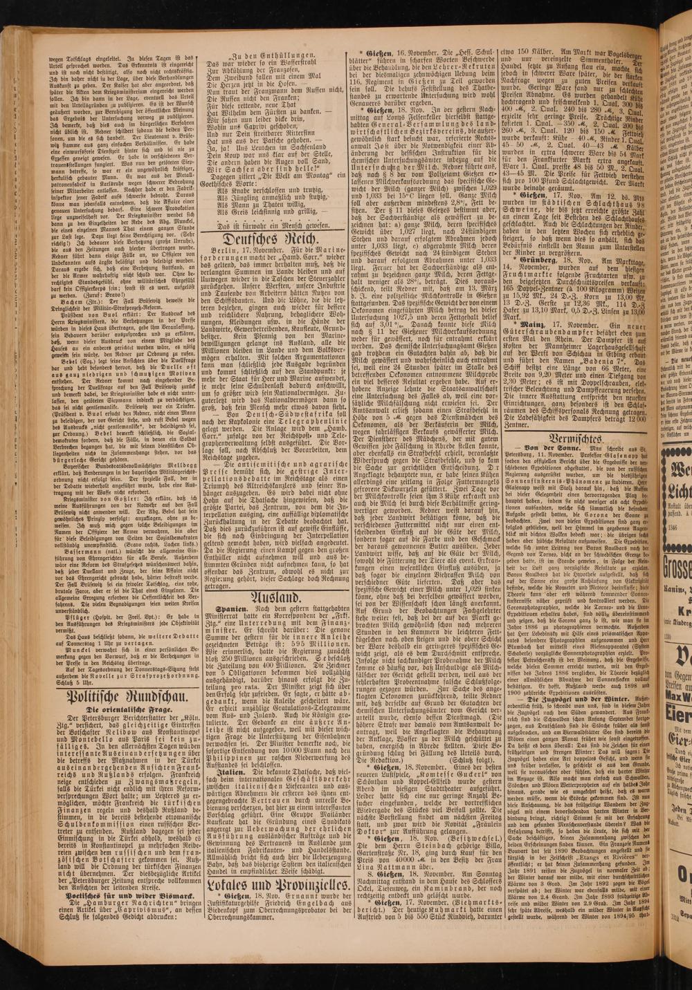 — Von der Sonne. Man schrelbt aus St. Petersburg, 11. November. Professor Glase napp hat soeben den offiziellen Bericht über die Ergebnisse der ber schiedenen Expeditionen abgestattet, die von der russischen Regierung ausgerüstet wurden, um die diesjährigen Sonnenfinsternis⸗Phänomene zu studieren. Glasenapp weist mit Stolz darauf hin, daß die Russen bei dieser Gelegenheit einen hervorragenden Platz be hauptet haben, indem sie nicht weniger als acht Expehl tionen aussandten, welche sich sämmtlich die besondent Aufgabe gestellt hatten, die Corona der Sonne beobachten. Zwei von diesen Expeditionen sind ganz er folglos geblieben, weil der Himmel im gegebenen Auge, blick mit dichten Wolken bedeckt war; die übrigen sechz haben aber hübsche Resultate aufzuweisen. Die Expedition,