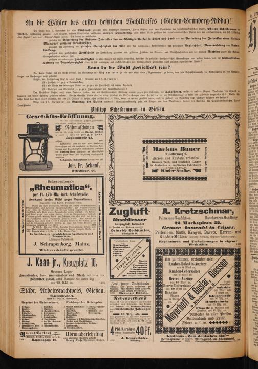 Der Kreis Gießen hat ein Recht darauf, im Reichstage wirklich vertreten zu sein und nicht einen„Abgeordneten“ zu haben, dem sein Geschäftsinteresse die Betheiligung an den Verhand⸗