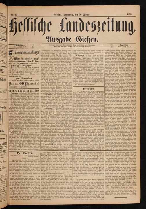 Lokales und Provinzielles. Gießen, 19. Februar. Der Fa schings krubel gestern setzte verhältnismäßig trotz des überaus günstigen Wetters spät ein. 4 Bläser mit dahinter marschierenden 6 Mann in kanarien⸗ gelben Kueipjacken zogen den Seltersweg zuerst un die Höhe nach dem Markte zu und erregten die allgemeine Heiterkeit. Die Korps fuhren auf 2 mit Tannengrün geschmückten Erntewagen un einer Musikbande spazieren. Die Alemannen