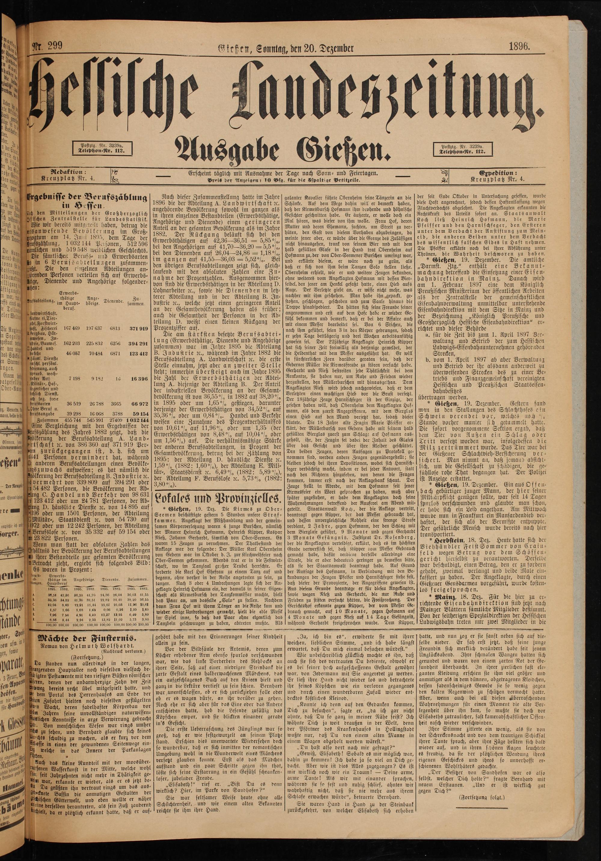 * Gießen, 19. Dezember. Die amtliche „Darmst. Ztg.“ enthält eine Bekannt⸗ machung betreffend die Einsetzung einer Eisen⸗ bahndirektion in Mainz. Danach wird am 1. Februar 1897 eine dem Königlich Preußischen Ministerium der öffentlichen Arbeiten als der Zentralstelle der gemeinschaftlichen Eisenbahnverwaltung unmittelbar unterstehende Eisenbahndirektion mit dem Sitze in Mainz und der Bezeichnung„Königlich Preußische und Großherzoglich Hessische Eisenbahndirektion“ er⸗ richtet und dieser Behörde