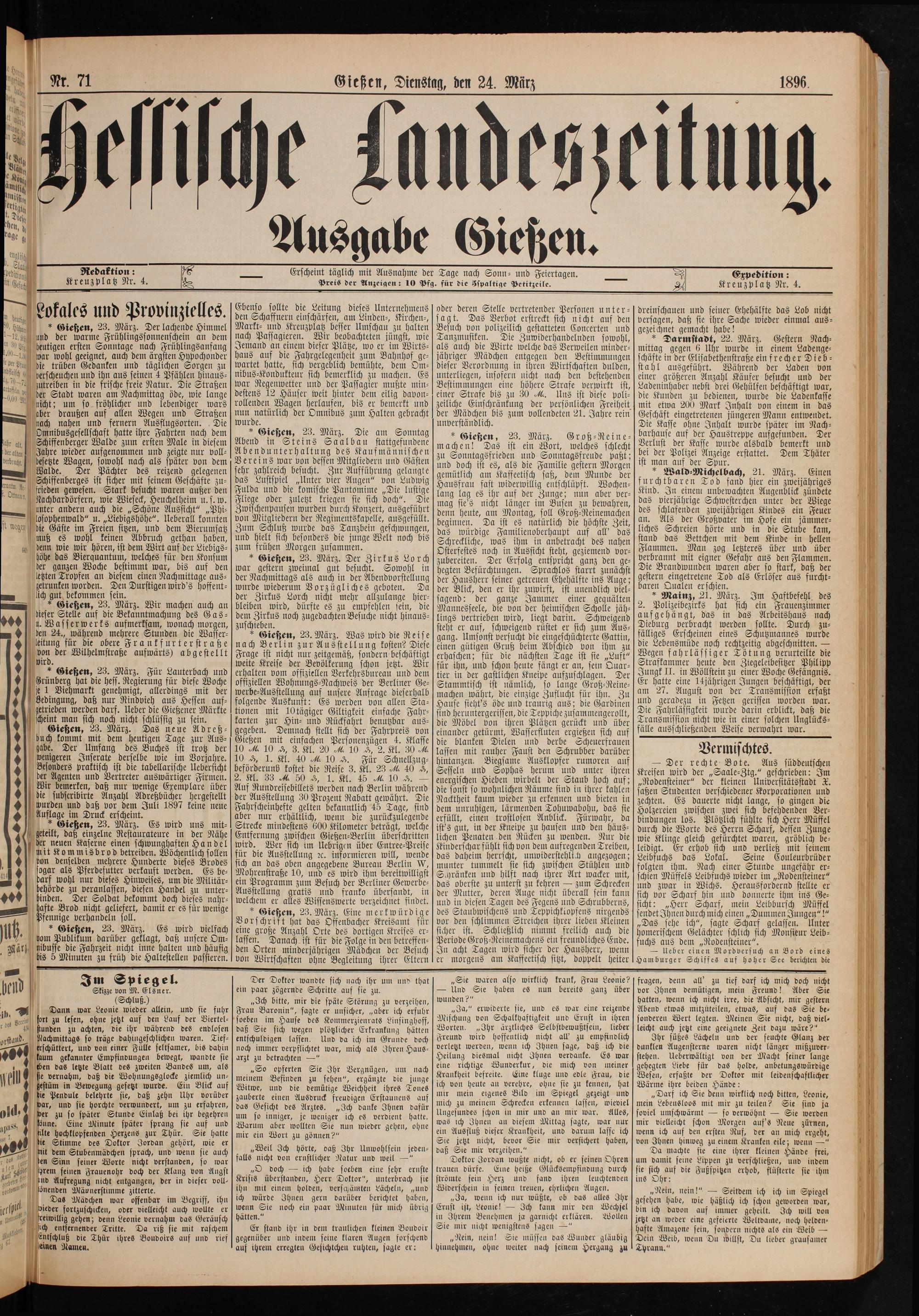 Gießen, 23. März. Das neue Adreß⸗ buch kommt mit dem heutigen Tage zur Aus⸗ gabe. Der Umfang des Buches ist trotz der wenigeren Inserate derselbe wie im Vorjahre. Besonders 120 0 ist die tabellarische Uebersicht der Agenten und Vertreter auswärtiger Firmen. Wir bemerken, daß nur wenige Exemplare über die subscribirte Anzahl Adreßbücher hergestellt e und daß vor dem Juli 1897 keine neue