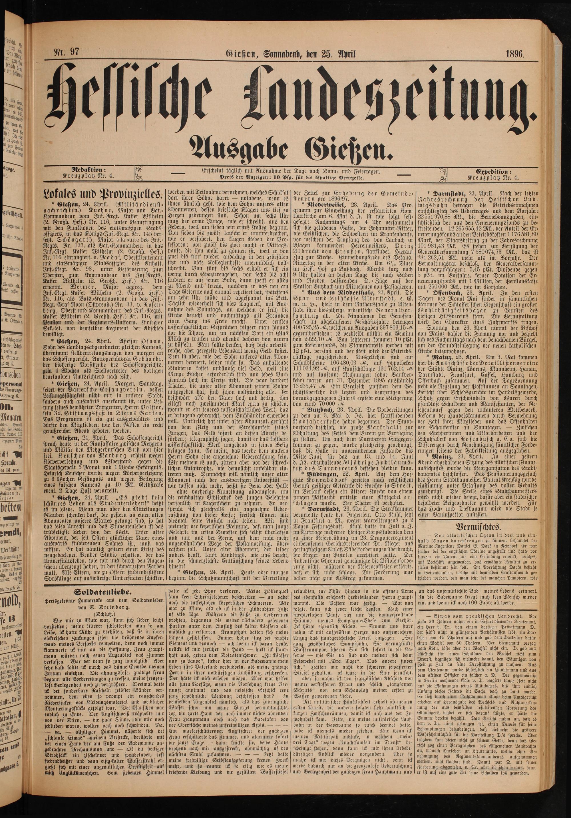 der Zettel zur Erhebung der Gemeinde— steuern pro 1896/97. »Niederweisel, 23. April. Das Pro⸗ gramm zur Einweihung der restaurirten Kom⸗ thurkirche am 6. Mai d. J. ist wie folgt fest⸗ gesetzt: Nachmittags um 4 Uhr versammeln sich die geladenen Gäste, die Johanniter-Ritter, die Geistlichen, die Schwestern im Krankenhause, vor welchem der Empfang des von Laubach zu Wagen kommenden Herrenmeisters, Prinz Albrecht von Preußen, stattfindet. Hierauf Zug zur Kirche. Einweihungsrede des Dekans. Rittertag in der alten Kirche. Um 6 Diner im Hess. Hof zu Butzbach. Abends kurz nach 9 Uhr halten an diesem Tage die nach Süden und Norden passirenden D.-Züge auf der Station Butzbach zum Mitnehmen von Passagieren. Aus dem Nidderthale, 23. April. Die Spar- und Leihkasse Altenstadt, e. G. m. u. H., hielt in dem Rathaussaale zu Alten⸗ stadt ihre diesjährige ordentliche Generalver⸗ samlung ab. Die Einnahmen der Genossen⸗ schaft im abgelaufenen Geschäftsjahre betrugen 400 725,25, welchen an Ausgaben 397 803,15. gegenüberstehen; es verbleibt mithin ein Gewinn von 2922,10. Von letzterem kommen 10 pCt. zum Reservefonds, die Stammanteile werden mit 12 pCt. verzinst und der Rest wird der Betriebs— rücklage zugeschrieben. Ausgeliehen sind auf Schuldscheine 106 480,03%, auf Hypotheken 111034,92, auf Kaufschillinge 131 762,14 und auf laufende Rechnungen(ohne Bankver— kehr) waren am 31. Dezember 1895 ausständig 13 235,47. Ein Vergleich zwischen dem Ge⸗ schäftsverkehr des letzten und demjenigen des vorausgegangenen Jahres ergiebt eine Steigerung von rund 70000 ¼ Butzbach, 23. April. Die Vorbereitungen zu dem am 3. Mai d. Is. hier stattfindenden Radfahrerfeste haben begonnen. Der Stadt⸗ vorstand beschloß, die große Markthalle zur Abhaltung des Festes dem Verein zur Verfügung zu stellen. Um auch dem Turnverein Entgegen⸗ kommen zu zeigen, wurde gleichzeitig genehmigt, daß die Halle in unverändertem Zustande bis Mitte Juni, für das am 13. und 14. Juni d. Is. abzuhaltende 50 jährige Jubiläums⸗ fest des Turnvereins bestehen bleiben kann. Büdingen, 22. April. Auf dem Hof⸗ gute Konradsdorf gerieten nach reichlichem Genuß geistiger Getränke die Knechte in Streit, im Verlauf dessen ein älterer Knecht von einem jungen Mitknecht mittelst einer Mistgabel er⸗ schlagen wurde. Der Thäter ist verhaftet. *Darmstadt, 23. April. Die Strafkammer verurteilte heute den Ingenieur Otto Ruhl, jetzt in Frankfurt a. M., wegen Kartelltragens zu 2 Tagen Festungshaft. Ruhl hatte im Juli v. J. im Auftrage mehrerer hiesiger Korpsstudenten dem zu einer Reserveübung im 23. Dragonerregiment einberufenen Gerichtsreferendar Dr. Rieger aus geringfügigem Anlaß Säbelforderungenüberbracht, die Rieger auf Pistolen acceptiert hatte. Der studentische Ehrenrat genehmigte die Pistolenforde⸗ rung nicht, während der Reserveoffizier erklärte, daß er sich nicht schlage. Die Forderung war daher nicht zum Austrag gekommen.