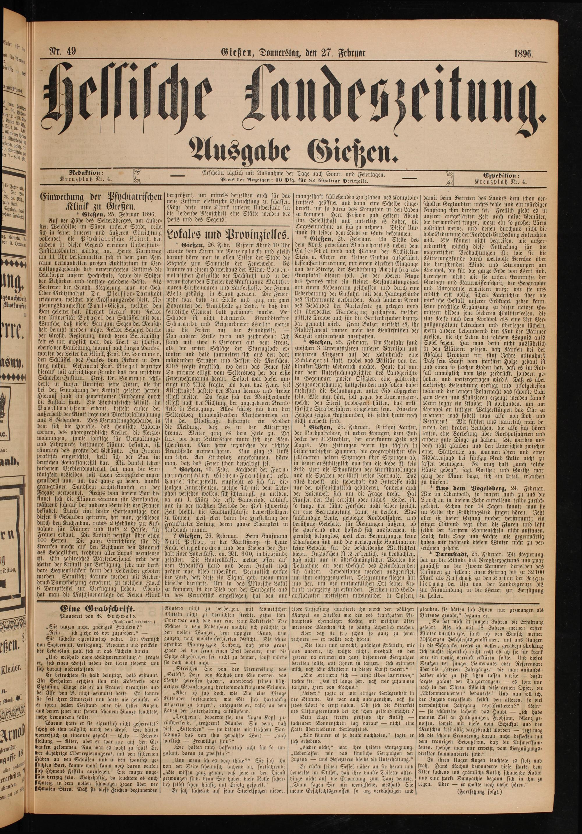 Gießen, 26. Febr. Gestern Abend 10 Uhr ertönte vom Turm die Feuerglocke und gleich darauf hörte man in allen Teilen der Stadt die Signale zum Sammeln der Feuerwehr. Es brannte an einem Hinterhaus der Witwe Löwen— stein'schen Hofraithe der Dachstuhl und in der daran stoßenden Scheuer des Kaufmanns Walther waren Bürstenwaren und Läuferstoffe, der Firma Welz gehörig, in Brand geraten. Die Feuer⸗ wehr war bald zur Stelle und ging mit zwei Hydranten der Brandstelle zu Leibe, so daß das feindliche Element bald gedämpft wurde. Der Schaden ist nicht bedeutend. Branddirektor Schmandt und Beigeordneter Wolff waren mit die Ersten auf der Brandstelle. Von anderer Stelle wird uns geschrieben: Ich stand mit etwa 6 Personen auf dem Kreuz, als die ersten Schläge der Sturmglocke er⸗ tönten und bald sammelten sich aus den dort mündenden Straßen und Gassen die Menschen. Alles fragte ängstlich, wo denn das Feuer sei? Da stürmte eiligst vom Seltersweg her der erste Feuerwehrmannn heran. Sofort war dieser um— ringt und Alles fragte, wo denn das Feuer sei! Alicestraße! hastete der Mann heraus und strebte eiligst weiter. Da setzte sich der Menschenhaufe eiligst nach der Richtung der angegebenen Brand— stelle in Bewegung. Alles schloß sich dem den Seltersweg hinabwälzenden Menschenstrom an An der Plockstraße bestätigte ein Soldat die Meldung, daß es in der Alieestraße brenne. Weiter ging es dem Ziele zu. Da kurz vor dem Seltersthor staute sich der Men⸗ schensttom. Man hatte inzwischen die richtige Brandstelle nennen hören. Nun ging es links um kehrt. Am Kirchplatz angekommen, hörte man, daß das Feuer schon bewältigt sei.