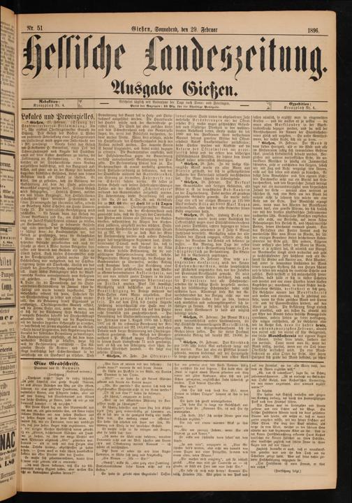 Gießen, 28. Februar. Das Adreßbuch pro 1896 läßt dieses Mal auffallend lange auf sich warten. Nun hat aber ein Pfiffikus heraus⸗ gebracht, warum diesesmal mit der Herausgabe so lange gezögert wird. Mit dem ersten April