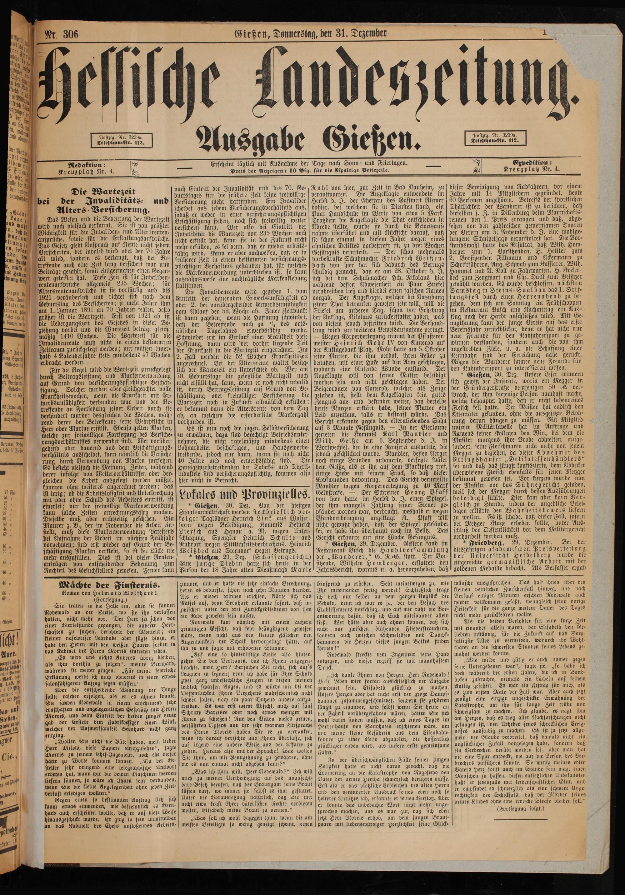 Lokales und Provinzielles. * Gießen, 30. Dez. Von der hiesigen Staatsanwaltschaft werden steckbrieflich ver⸗ folgt: Taglöhner Heinrich Link aus Wolfer⸗ born wegen Beleidigung, Kommis Heinrich Liersch aus Hanau a. M. wegen Unter⸗ schlagung, Spengler Heinrich Schulte aus Ruhrort wegen Sittlichkeitsverbrechens, Heinrich Weißbeck aus Sterndorf wegen Betrugs. Gießen, 29. Dez.(Schöffen gericht.) Eine junge Diebin hatte sich heute in der