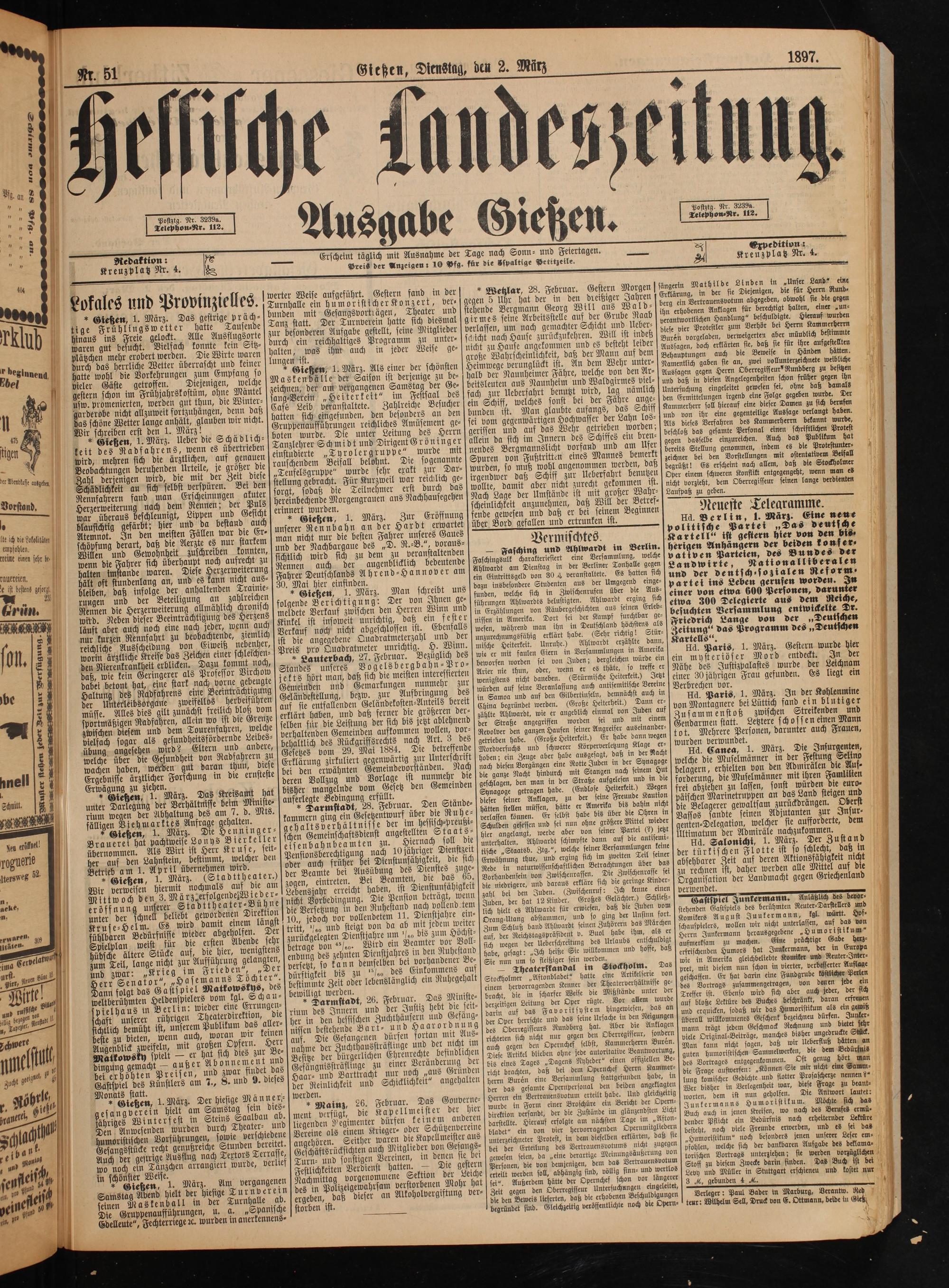 ärztli i f schen⸗ Preis pro Quadratmeter unrichtig. H. Winn. mische Heiterkeit. Unruhe.) Ahlwardt erzählte dann, Kartells“. dun daneben krniken. Dun konnt noc* Lauterbach, 27. Februar. Bezuͤglich des] wie er mit faulen Eiern in Versammlungen in Amerika Hd. Paris, 1. März. Gestern wurde hier daß, wie kein Geringerer als Professor Virchow Standes unseres Voge lsbergbahn⸗Pro⸗ beworfen worden sei von Juden; 1 11 einein my steriöser Mord entdeckt. In der dabei betont hat, eine stark nach vorne gebeugte jekts hört man, daß sich die meisten interessierten] Arier nie thun, e we face 1 re f 11 Nähe des Justizpalastes wurde der Leichnam Haltung des Radfahrens eine Beeinträchtigung Gemeinden und Gemarkungen nunmehr zur wanne 159 82 1 10 ag en d einer 30 jährigen Frau gefunden. Es liegt ein e müsse. Alles dies gilt zunächst freilich bloß vom auf sie entfallenden Geländekosten⸗Ankeils bereit China begründet werden.(Große Heiterheit.) Dann er⸗ Hd. Paris, 1. März. In der Kohlenmine sportmäßigen Radfahren, allein wo ist die Grenze erklärt haben, und daß ferner die größeren der⸗ ählte Ahlwardt wie er angeblich einmal von Juden auf von Monkagnere bei Lüttich fand ein blutiger zwischen diesem und dem Tourenfahren, welche selben für die Leistung der sich bis jetzt ablehnend der Straße angegriffen worden sei und mit einem Zu amm enstoß zwischen Streikenden und vielfach sogar als gesundheitsfördernde Leibes⸗ behollich des Rückgriff, 28 ug 9 1 pes Revolver den ganzen Haufen seiner Angreifer auseinander⸗ re de ung übung angesehen wird? Eltern und andere, behaltlich des N griffgre nach Ark.. getrieben habe.(Große Heiterkeit.) Er habe dann wegen a.. ü i i tern zu] Gesetzes vom 29. Mai 1884. Die betreffende Mordversuchs und schwerer Körperverletzung Klage er⸗ wurden verwundet. 5 f gen heben, ner gen dare de 0 diee Erklärung zirkuliert gegenwärtig zur Unterschrift hoben; ein Jeuge aber habe ausgesagt, daß in der Nacht: Id. Canea, 1. März. Die Infurgenten, Ergebnisse ärztlicher Forschung in die ernsteste bei den erwähnten Gemeindevorständen. Nach nach diesen Vorgängen eine Rotte Juden in der Synagoge welche die Muselmänner in der Festung Selino Erwägung zu ziehen. deren Vollzug und Vorlage ist nunmehr die die ganze Nacht hindurch mit Stangen nach seinem Hut belagern, erhielten von den Admirälen die Auf⸗ * Gießen, 1. März. Das Kreisamt hat bisher mangelnde vom Gesetz den Gemeinden geschlagen, den man in der Straße aufgelesen und in die forderung, die Muselmänner mit ihren amlilien Darlegung der B hältnisse beim Ministe⸗ auferlegte Bedingung erfüllt. Synagoge getragen habe.(Endlose Hetterkeit) Wegen frei abziehen zu lassen, sonst würden die euro⸗ unter arlegung 5 er Verhältuisse beim* Sarmstadt, 28 Februar. Den Stände⸗ dieser seiner Anklagen, zu der seine Freunde Kaution päischen Marinetruppen an das Land steigen und kum wegen der Abhaltung des am 1. d. Mts g in 0 her di„hätten stellen müssen, hätte er Amerika bis dahin nicht] di 1 lt ückdrä Oberst fälli 6 A kammern ging ein Gesetzentwurf über die Ruhe 0 i ie ie Belagerer gewaltsam zurückdrängen. er gen jehmarktes nfrage gehalten. 5 J ee e verlassen können. Er selbst habe bis über die Ohren in 5 a 5 * Gießen, 1. März. Die Henninger gehaltsverhältuisse der im hessischepreußi⸗ Schuld 5 fel hne größere Mittel wieder Vassos sandte seinen Adjutanten zur Insur Braueref hat bachtweife Zons Bierkeller schen Gemeinschaftsdienst angestellten Staats 1 ee werde aber von feuer Parte() ke genten⸗Delegation, welcher sie aufforderte, dem übernommen. Als Wirt ist Herr Kruse, seit⸗ eisenbahnbeamten zu. Hiernach soll die unterhalten. Ahlwardt schimpfte dann auf die antisem⸗ Ultimatum der Admiräle nachzukommen.