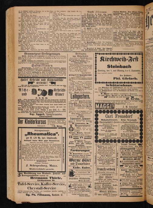 Zum Abhalten von Festlichkeiten aller Art halte ich die Lokalitäten dem verehrten Publikum von Gießen und Umgebung bestens empfohlen. Das Schützenhaus bildet für Gesellschaften und Vereine einen sehr be⸗
