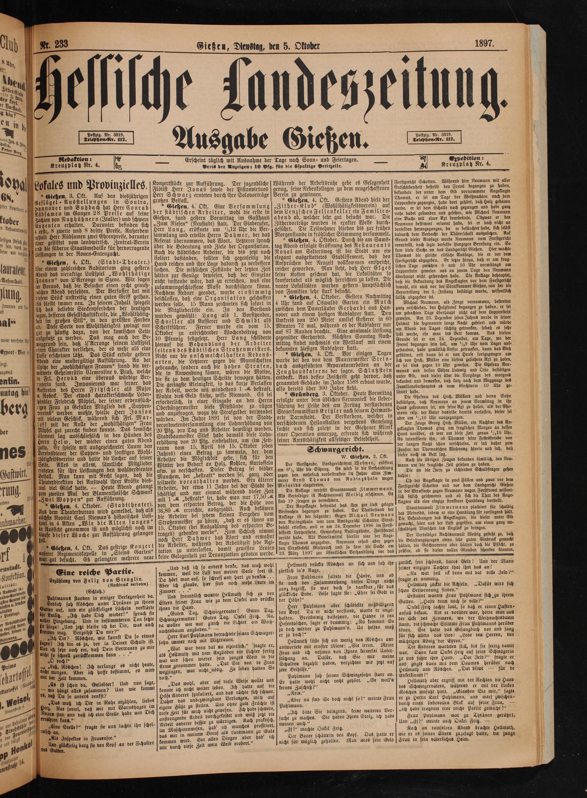 Die Zithervorträge wurden in exakter Weise durch⸗ geführt. Die Teilnehmer blieben bis zur frühen Morgenstunde in fröhlicher Stimmung versammelt. * Gießen, 4. Oktober. Durch die am Sams⸗ tag Abend erfolgte Eröffnung des Restaurants Royal am Seltersweg ist die Stadt um ein elegant ausgestattetes Etablissement, das den Ansprüchen der Neuzeit vollkommen entspricht, reicher geworden. Man steht, daß Herr Elges keine Kosten gescheut hat, die Lokalitäten so komfortabel als möglich herrichten zu lassen. Die neuen Lokalitäten wurden gestern hauptsächlich von Familien sehr stark besucht.