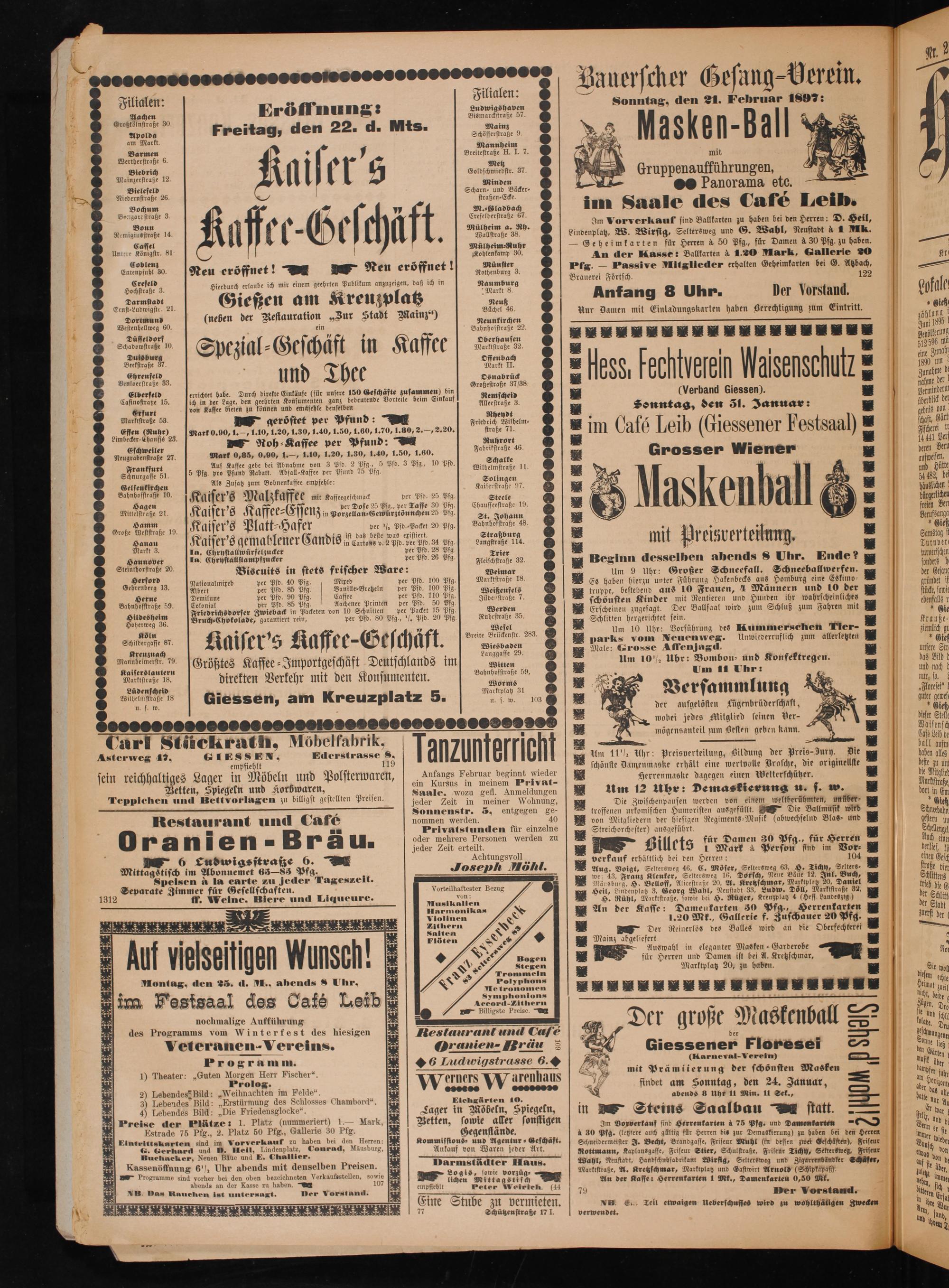 Filialen: 8 i Filialen: 4„ Sonntag, den 21. Februar 1897 0 Ludwigshaven Aachen Erö n 1 9823 2 Bismarckstraße 57. 8 ßtölnstraße 3— Mainz N 2— enk 0 Freitag, den 22. dd. Mts. Schöfferstraße 9 5 8 3 2. Markt. Mannheim 59 g S 7 Breitestraße H. I. 7. 8* mit aße 6. x Me uffü 5* 5 Gilda e 37 Gruppena ührungen,. Mainzerfraße 12 1* 588 Panorama etc. Scharn⸗ und Bäcker⸗ 17 Bielefeld 5 eee 2 5 1 imm Saale des Cafe Leib. 7 8 E M. ⸗Sladbach 8 8 e e 3 9 4 K Crefelderstraße 67. Im Vorverkauf sind Ballkarten zu haben bei den Herren: D. N Bonn 90 Mülheim a. Rh. Lindenplatz, W. Wirsig, Seltersweg und G. Wahl, Neustadt à 1 Mk.* N aii he 14 9 8 5 9 5 5 Fre e ee Dames Pfg. a Faden 2 r 7 7* 9 6 5 U N 81 r 30 An der Kasse: Ballkarten à 1. 20 Mark, e 3 are m 5 5 imkarten bei G. ach,—— 8— Mitglieder erhalten Geheim Coblenz 5 ö Neu eröffnet! acute; Fig.— Passive Mies 122 Entenpfubl 30. Neu eröffnet 1 2 Rothenburg 3. Brauerei Förtsch. f 0 Nofale. g 1. 45 765 bli ei ß ich in Naumburg 0 ö Crefseld a laube ich mir einem geehrten Publikum anzuzeigen, daß i van f Orstan 5 Hochstraße 3. 3 au Kreu platz 8 Anfang 8 Uhr. ber i N a geh 5 5 Gießen am 3 1* 0. Nur Damen mit Einladungskarten haben Serechtigung zum Eintritt. blen r ion„Zur Stadt Mainz i Jun 600 2 neben der Restauration„Zur 8 2 Neunkirchen 10 4 Wa n 00. 0 5 Bahnhosstraße 22 8 1 1. 1* 2 55 8. 20.**.** 2 1.— Bann 1 2 f Oberhausen 5125 Düsseldorf K er eee 6 ö 3 l Spezial⸗Geschäft in Kaffce es 3 0 0e. 1 dh 2 Duisburg offenbach 2*. e 0 2 5 Mar. E Beelstraße 37.. bo bU Zuna f — Ehreuseld und Thee een 11 ö f* rahme 12 2 ebe 28 sere 150 Geschäfte zusammen) bin 5 5 5(Verband Giessen). 1 a 5 ö be. Durch direkte Einkäufe(für unsere e e a Remscheid 8 überblick del n 5 5 den geehrten Konsumenten ganz bedeutende Vorteile beim Einkauf Alleestraße 3. Sonntag, den 31. Januar 2* gb bon! s 5 ee bieten zu können und emafehle denselben 1 4 4— haft, Gärt Erfurt 1 g 5 d: 2 f A N N N F t 1 al 1 le n e Len f, 54s, 150 1, 50, ate, S. fee b., 8 E im Café Leib(Giessener Festsa 1 12 2 5 60, 1.70, 1. S N. 0 5* 144 5 Essen(Ruhr) Mark 0.90, 1.—, 1.10, 1.20, 1.30, 1.40, 1.50, 1.60, *—. Ruhrort Beru Limbecker⸗Chausss 23. RNoh⸗Kaffee per Pfund: Fabisraße 46 5 Grosser Wiener. daun en Eschweiler 0, 1.—, 1.10, 1.20, 1.30, 1.40, 1.50, 1.60. 2 aufweisen. Neugrabenstraße 27. Mark 0,85, 0.90, 1.—, 1.10, 1. 1 7 mes 2 fe 10 Pfd Schalke 0. und Hütte a 4 Auf Kaffee gebe bei Abnahme von 3 Pfd. 2 Pfg., 5 Pfd. 3 Pfg., Pfd. Wilbelmstraße 11. 1 9 1 54482 be Frankfurt 5 Pfg. pro Pfund Rabatt. Abfall⸗Kaffee per Pfund 75 Pfg. 9 N N 10% Le Schnurgasse 51. e f Alle„Solingen. 8 häuslichen Als Zusatz zum Bohnenkaffee empfehle: Kafserstraße 97. 1 I waerlicher Gelsenkirchen 5 2 8 5 N A. bürgerlt Bahnhofstraße 10. Kaiser's Maldzkaffee mit Kaffeegeschmack per Pfd. 25 Pfg 1 5 S 3 0 0 5 freien Ber se 25 Pfg., p sse 30 Pfg. Chausseestraße 19. 977 Hagen Kaiser's K e⸗Essen ae e D AN Berufsanga Mittelstraße 21. Kaiser 8 · 0 ek⸗. Fin Porzellan⸗Gewürztönn hen 2“ g. d enge 48 1 5** Gieß F giser's 8 Hafer ½ Pfd.⸗Packet 20 Pfg. eee 2 N 71 47 Samstag ft Hamm b Haser per ½ Pfd.„arte 0 Samstag Große Weststraße 19. Kaiser 8 Platt 5 f 43 ist das beste was existiert. Straßburg 1 mit 1 elzvel tek ung.*. Turn ver. Hanau Kaiser's gemahlener Candis actes. 2 Pf ber fd. 33 555 Langstraße 114.— 5 Aiden Markt 3. la. Chrystallwürfelzucker per Pfd. 26 fg Feier, Beginn desselben abends 8 Uhr. Ende? ß sordud 9 Hounover in Ghenstanstanepfrucker 5 5 n 2 Um 9 Uhr: Großer Schneefall. Schneeballwerfen. W der Gesan Steinthorstraße 20. Biscuits in stets frischer Ware: 1 Marne 15 H 10 1 Fübrung Hafenbecgs ang e et Herford Nationalmixed per Pfd. 40 Pfg. Niere aer a 0 g. e e e is 10 Frauen, 1 Männern und 10 der stücke, sowi Gehrenberg 13. Albert per Pfd. 85 Pfg W 15 190 110 0 Jide— ene 5 eren 11775 Hunden ihr wahrscheinliches chensalle r ö der Pfd. 90 Pfg. Caffee 5d.. Jildenstraße 7. onsten f a A 2 5 8 7 ustenge 59 ue ber 9975 85 515 Aalener Printen per 1915 10 500 29 2780 8 2 5 8 zugesagt. Der Ballsaal wird zum Schluß zum Fahren mit 1* Gie Ba aße 3. I nee in Packete 10 Schnitten per Packet 15 Pfg. e 2 5 9 strauße— 5 Friedrichsdorser Zwieback in Packeten von 10 Pfd. 80 Pfg.,/ Pfd. 20 Pfg Ruhrstraße 35. Schlitten hergerichtet sein.* 1 ee c 8.,, 3 5 Wesel 2* um 10 Uhr: Vorführung des Kummerschen K.* 145 Köln 108* G II 1. Breite Brückenstr. 283. 3 2 parks vom Neuenveg. Unwiederruflich zum allerletzten 8 Ciel Schildergasse 87. Kaiser 5 I ek 1. L* Wies baden Male: Grosse Affenjagd.* 110 707 15; Langgasse 29. 2 2% Uhr: Bombon- und Konfektregen. a8 Bild Kreuzuach 1 5 ue D t chl ds im 5 Um 10 2 r: 5* und nach 0 Malnbeieift 70.[Größtes Kaffee⸗Importgeschäft Deutschlands Guta 8 N Um 11 Uhr:— 1 050 Kaiserslautern f 5 1** 9 5 Bahnhosstraße 99, 9. f Malisseaße is. direkten Verkehr mit den Konsumenten. ens, 8 E Verf am mlun g— 1120 Marktplatz 3 0. guter gewes. Lüdenscheid— N 5 2 28 1 Wibellese 18 Giessen, am Kreuzplatz 5. ee* der aufgelösten Lügenbrüderschaft,* 1 5 Eleß u.. w. wobei jedes Mitglied seinen Ver-— Bolsenst Zeosesse sse οο οοοοοοοο οοοοο 51 mögensanteil zum gesten geben kann.— Case deb ge 222(.— e ˙ 272 72 ball aufm 1 N 25 N 7 5 2 7 1 2 Carl Stückrath, Mobelfabrik. Tanzunterricht* Um 11 Uhr: Preisverteilung, Zildung der Preis-Zury. Die 57 5 alles Asterweg 42. 6 1 e e 1195 2 schönste Bamenmaske erhält eine wertvolle 1 origmeune* de Nl empfieh a 5 i ieder ze d en einen Wetterschützer.. — 7 a 3 9* Anfangs Februar beginnt wiede 3 Herrenmaske dagegen 0 Mortsraße sein reichhaltiges Lager In Möbeln und Polsterwaren, ein Kursus in meinem Privat- 1 12 uhr: Demaskierung u. s. w. 1 n 10 2 Spiegel d Korbwaren, 5„ Wozu gefl. Anmeldungen. m 12 5 i* 2 Betten, Zpiegeln und Korbwaren. Preise Jane aan Sell. ö Di isc sen werden von einem weltberühmten, unüber⸗ Gieß Teppichen und Bettvor