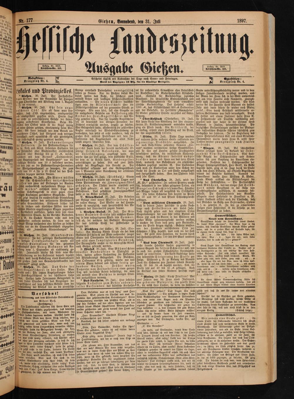 * Gießen, 30. Juli.(Diebstahl.) Einem Hausburschen wurde vor einigen Tagen aus einem Portemonnaie ein Zwanzigmarkstück gestohlen. Der Thäter wurde ermittelt und zur Haft gebracht; es war der Kollege des Bestohlenen. Das gestohlene Zwanzigmarkstück hatte er im Keller versteckt.