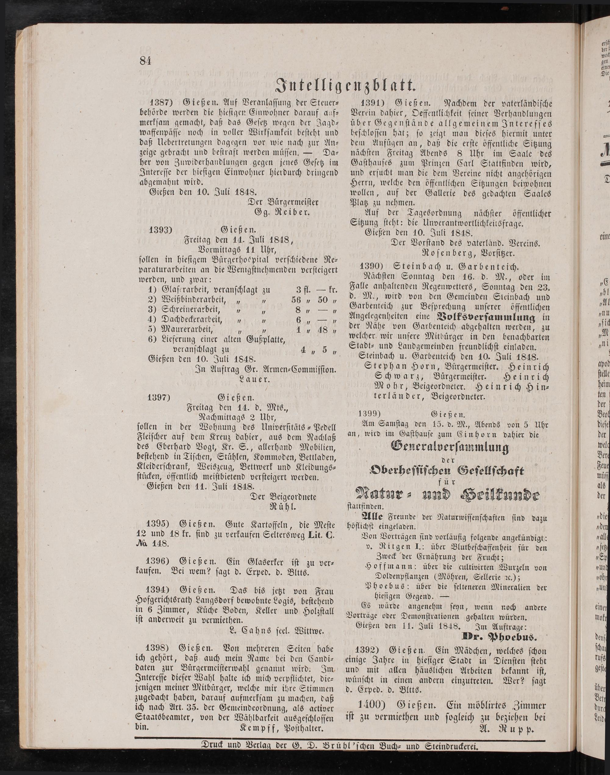 ftattfinden. Alle Freunde der Naturwissenschaften sind dazu höflichst eingeladen. Von Vorträgen sind vorläufig folgende angekündigt: v. Ritgen I.: über Blutbeschaffenheit für den Zweck der Ernährung der Frucht; Hoffmann: über die cultivirten Wurzeln von Doldenpflanzen(Möhren, Sellerie ꝛc.); Phoebus: über die selteneren Mineralien der hiesigen Gegend.— Es würde angenehm seyn, wenn noch andere Vorträge oder Demonstrationen gehalten würden. Gießen den 11. Juli 1848. Im Auftrage: Dr. Phoebus.