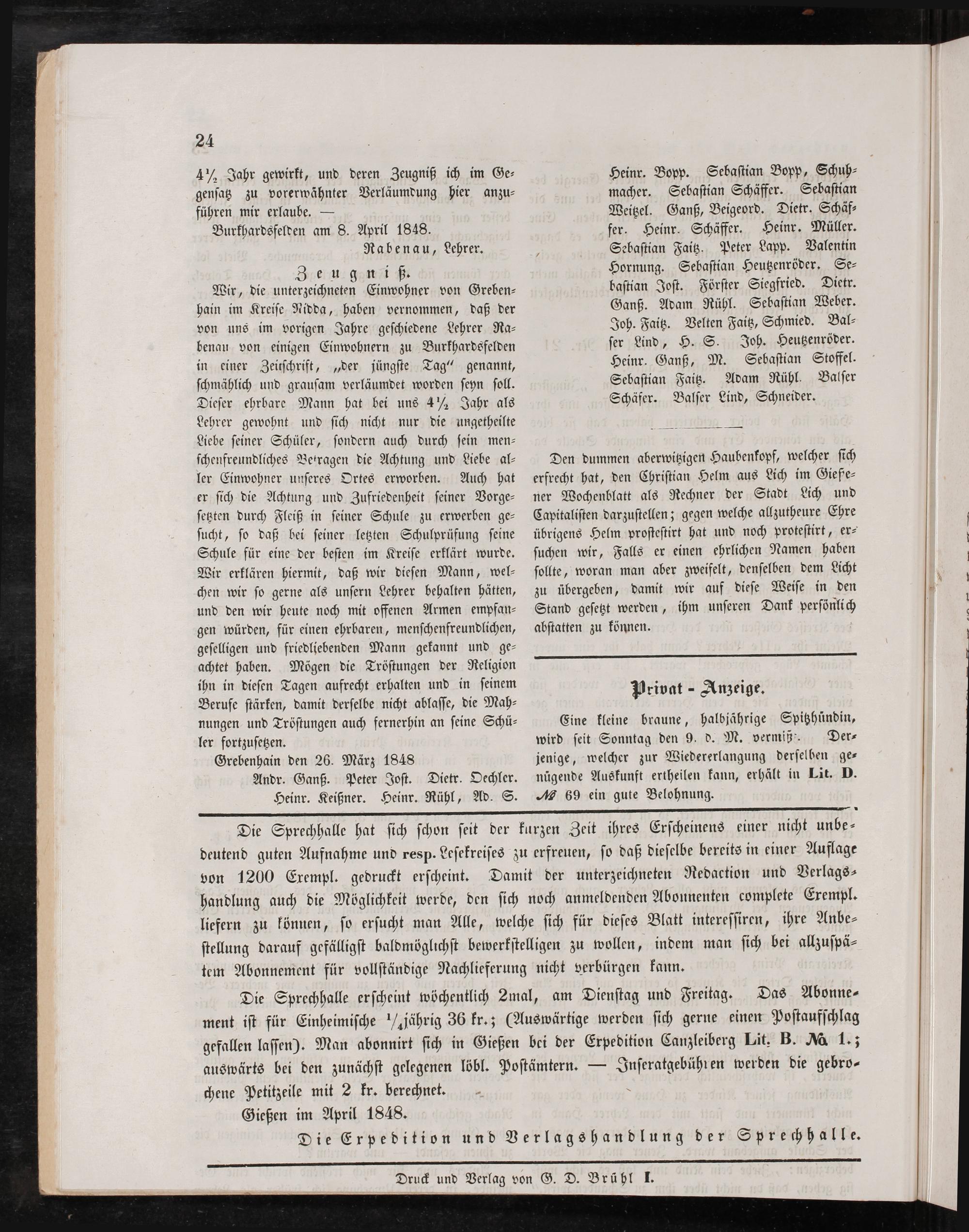 Die Sprechhalle erscheint wöchentlich mal, am Dienstag und Freitag. Das Abonne⸗ ment ist für Einheimische jährig 36 kr.;(Auswärtige werden sich gerne einen Postaufschlag gefallen lassen). Man abonnirt sich in Gießen bei der Expedition Canzleiberg Lit. B. d.; auswärts bei den zunächst gelegenen löbl. Postämtern.— Inseratgebühren werden die gebro— chene Petitzeile mit 2 kr. berechnet.