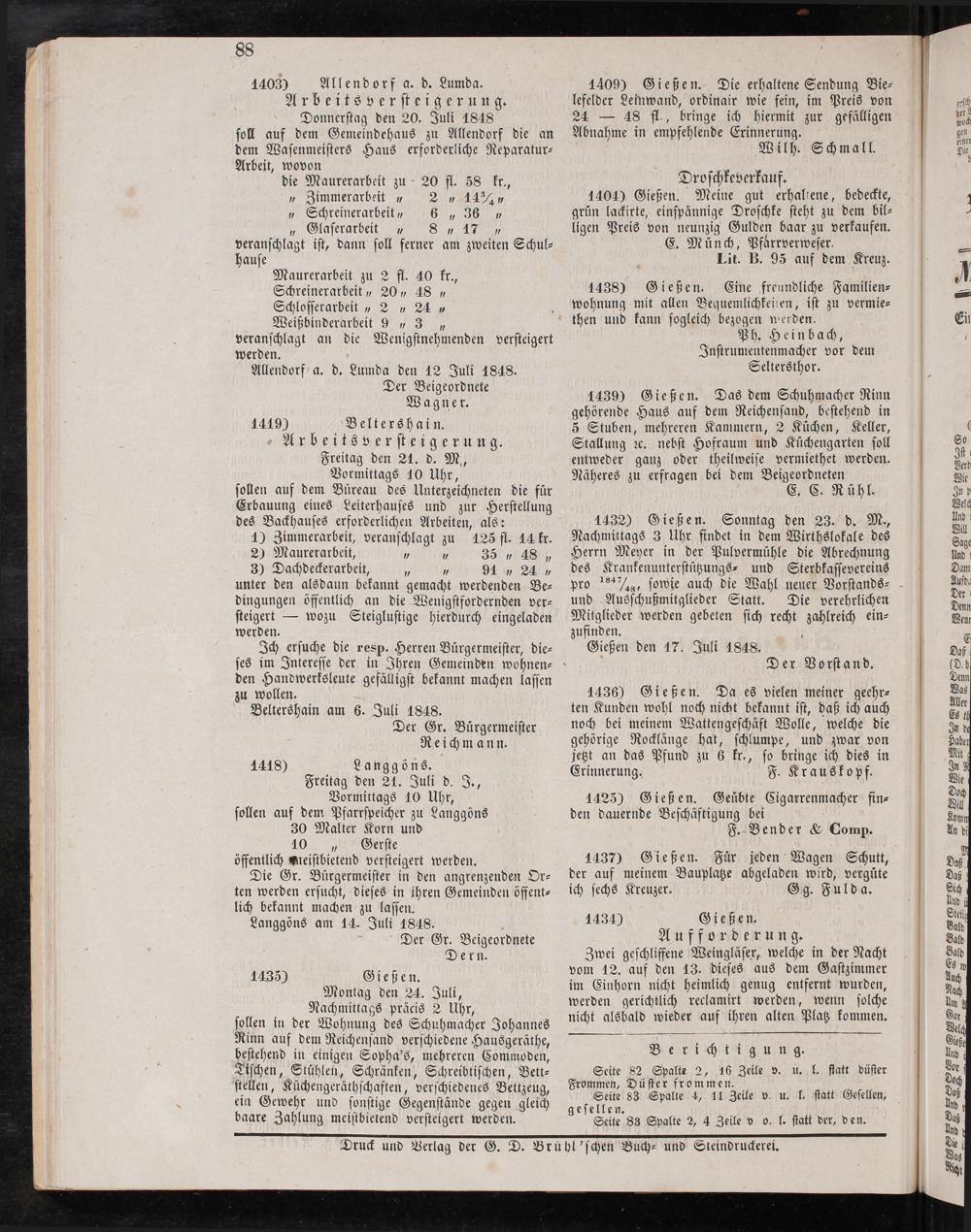 1403) Allendorf a. d. Lumda. Arbeits versteigerung. Donnerstag den 20. Juli 1848 soll auf dem Gemeindehaus zu Allendorf die an dem Wasenmeisters Haus erforderliche Reparatur-