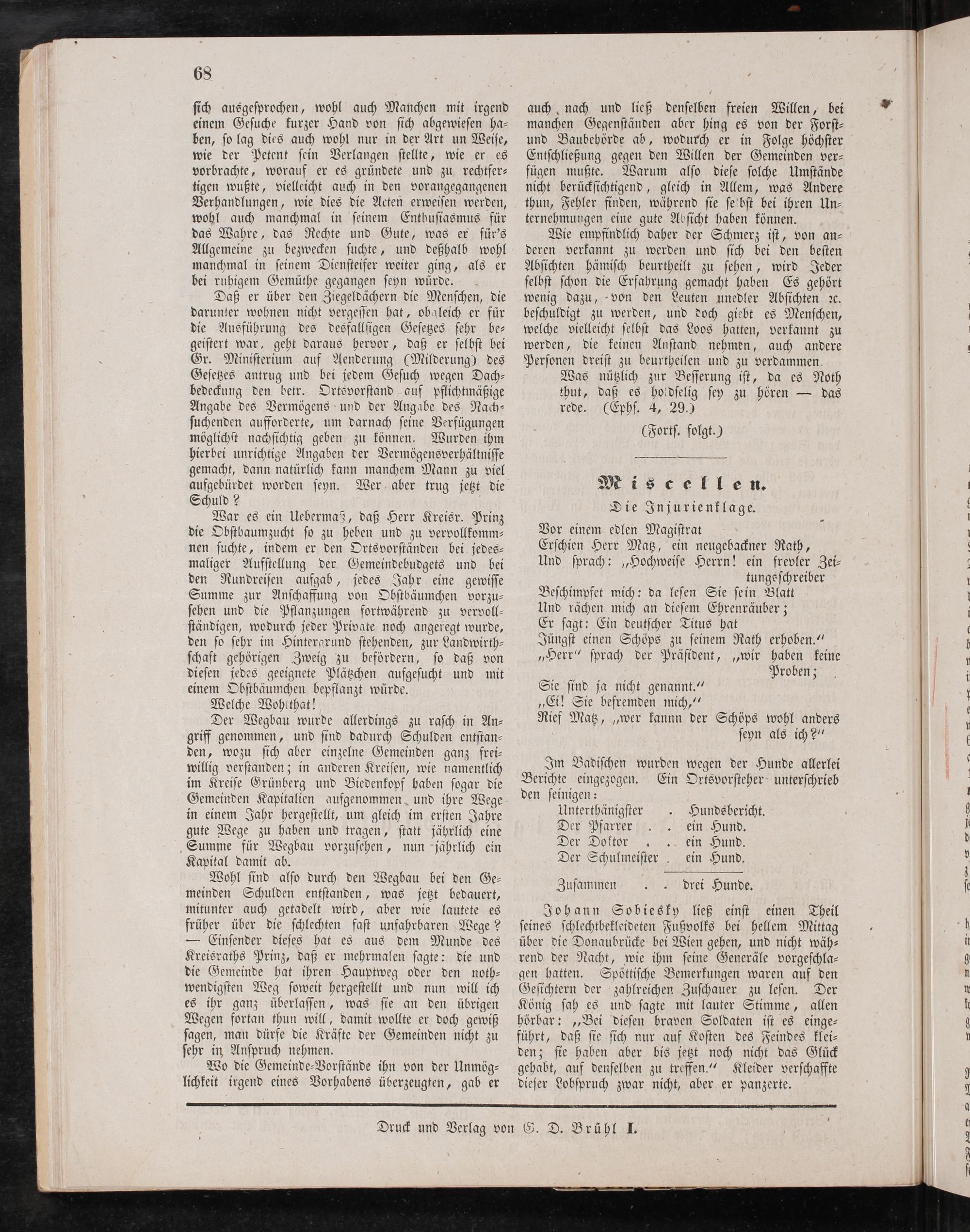 auch nach und ließ denselben freien Willen, bei manchen Gegenständen aber hing es von der Forst— und Baubehörde ab, wodurch er in Folge höchster Entschließung gegen den Willen der Gemeinden ver— fügen mußte. Warum also diese solche Umstände nicht berücksichtigend, gleich in Allem, was Andere thun, Fehler finden, während sie sebst bei ihren Un— ternehmungen eine gute Absicht haben können.