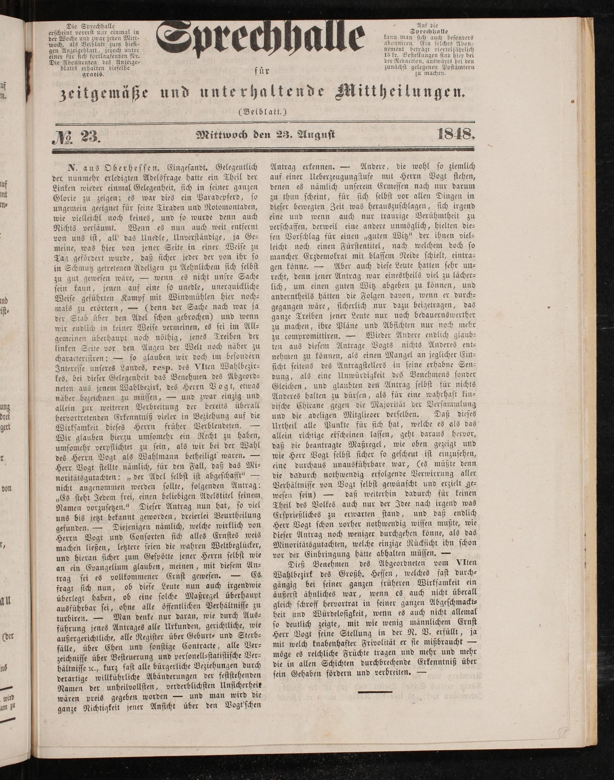N. aus Oberhessen. Eingesandt. Gelegentlich der nunmehr erledigten Adelsfrage hatte ein Theil der Linken wieder einmal Gelegenheit, sich in seiner ganzen Glorie zu zeigen; es war dies ein Paradepferd, so ungemein geeignet für seine Tiraden und Rotomontaden, wie vielleich! noch keines, und so wurde denn auch Nichts versäumt. Wenn es nun auch weit entfernt von uns ist, all' das Unedle, Unverständige, ja Ge— meine, was hier von jener Seite in einer Weise zu Tag gefördert wurde, daß sicher jeder der von ihr so in Schmutz getretenen Adeligen zu Aehnlichem sich selbst zu gut gewesen wäre,— wenn es nicht unsre Sache sein kann, jenen auf eine so unedle, unerquickliche Weise geführten Kampf mit Windmühlen hier noch⸗ mals zu erörtern,—(denn der Sache nach war ja der über den Adel schon gebrochen) und wenn wir endlich in keiner Weise vermeinen, es sei im All- gemeinen überhaupt noch nöthig, jenes Treiben der linken Seite vor den Augen der Welt noch näher zu characterisiren:— so glauben wir doch im besondern Interesse unseres Landes, resp. des VIten Wahlbezir— kes, bei dieser Gelegenheit das Benehmen des Abgeord— neten aus jenem Wahlbezirk, des Herrn Vogt, etwas näher bezeichnen zu müssen,— und zwar einzig und allein zur weiteren Verbreitung der bereits überall hervortretenden Erkenntniß vieler in Beziehung auf die Wirksamkeit dieses Herrn früher Verblendeten.— Wir glauben hierzu umsomehr ein Recht zu haben, umsomehr verpflichtet zu sein, als wir bei der Wahl des Herrn Vogt als Wahlmann betheiligt waren.— Herr Vogt stellte nämlich, für den Fall, daß das Mi⸗ noritätsgutachten:„der Adel selbst ist abgeschafft“— nicht angenommen werden sollte, folgenden Antrag: