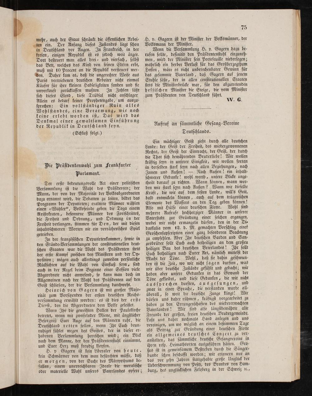 Wenn Ihr die geweihten Hallen der Paulskirche betretet, wenn mit zweifelnder Miene, mit ängstlicher Besorgniß Euer Auge auf den Männern ruht, die Deutschland retten sollen, wenn Ihr Euch beun— ruhiget fühlet wegen des Geistes, der in dieser er⸗ habenen Versammlung herrschen wird; ein Blick nach dem Manne, der den Präsidentenstuhl einnimmt, und Euer Herz muß freudig klopfen.