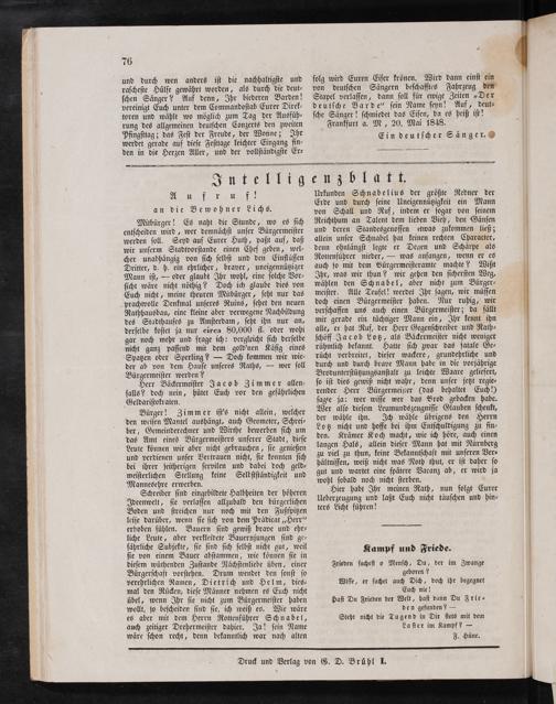 sche Sänger! schmiedet das Eisen, da es heiß ist! Frankfurt a. M, 20. Mai 1848.