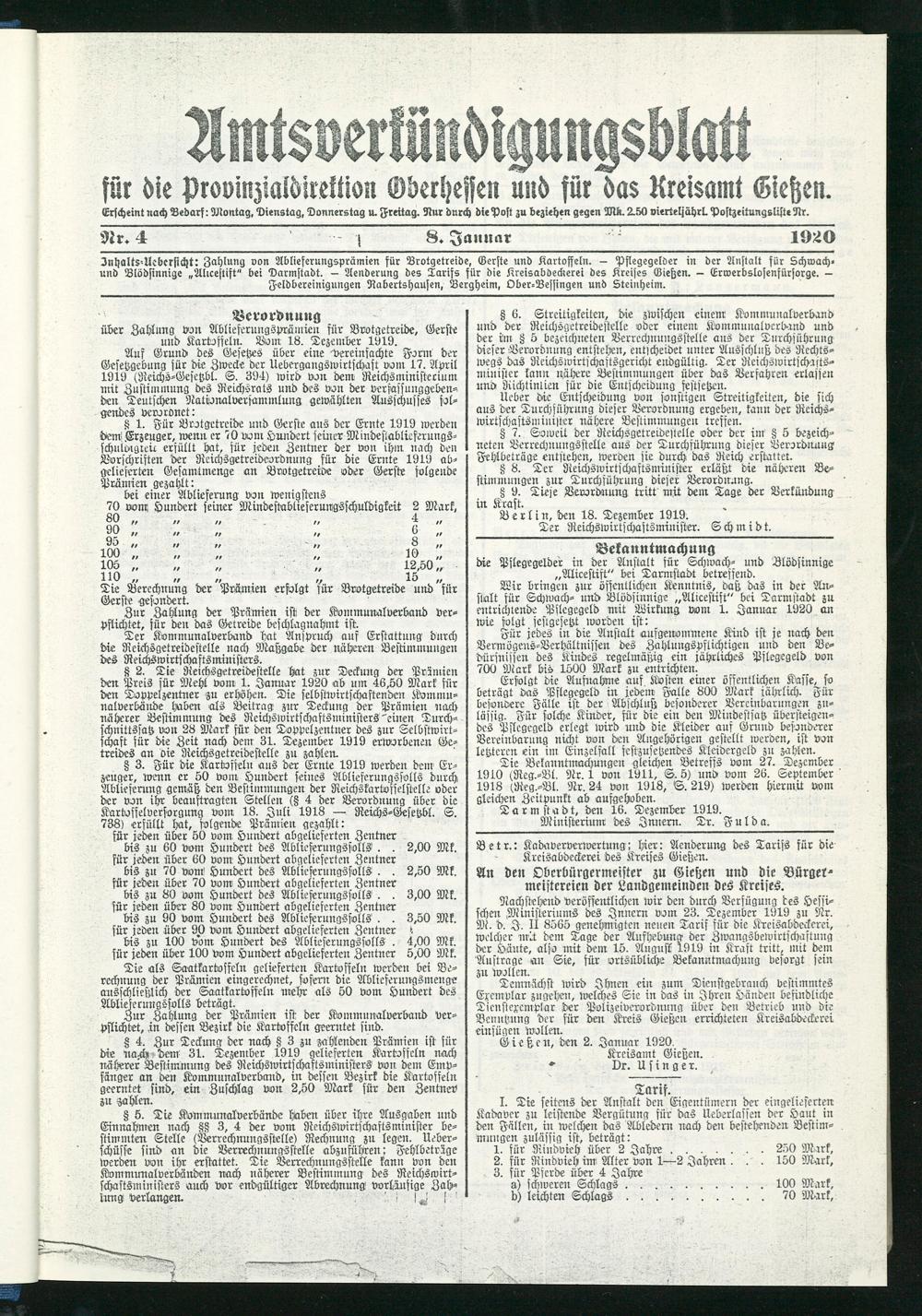 Jnhalts-Ucbcrsicht: Zahlung von Ablieferungsprämien für Brotgetreide, Gerste und Kartoffeln. - Pflegegelder in der Anstalt für Schwach- und Blödsinnige „Alrcestift" bei Darmstadt. — Aenderung des Tarifs für die Kreisabdeckerei des Kreises Gießen. — Erwerbslosenfürsorge. — Feldbereinigungen Rabertshausen, Bergheim, Ober-Bessingen und Steinheim.
