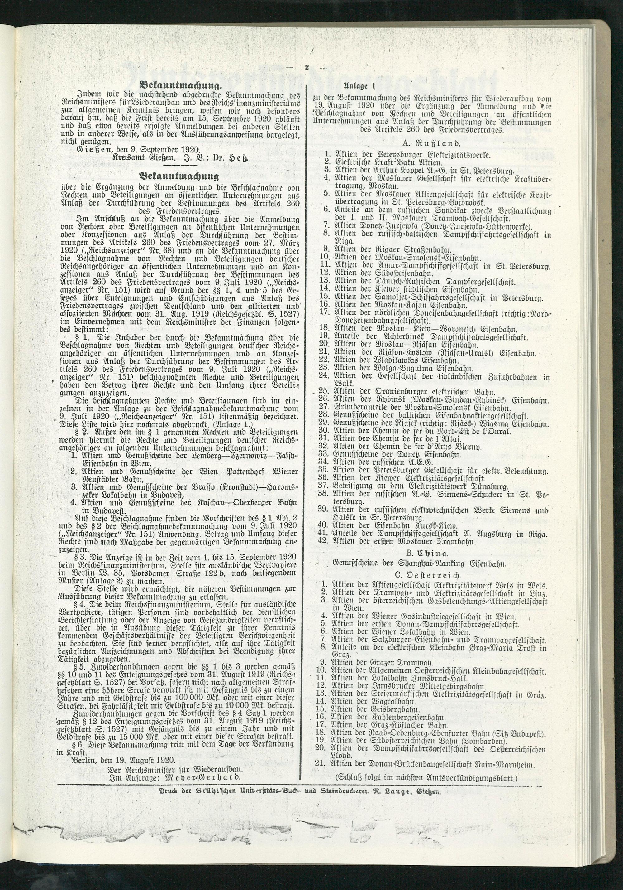 Tie beschlagnahmten Rechte und Beteiligungen sind im einzelnen in der Anlage zu der Beschlagnahmebekanntmachung vom , 9. Juli 1920 („Reichsanzeiger" Nr. 151) listenmäßig bezeichnet. Diese Liste wird hier nochmals abgedruckt. (Anlage 1.)