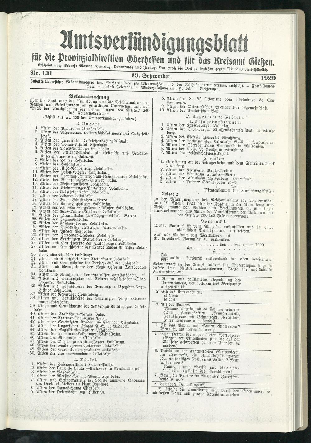 ^ächzung der Anmeldung und die Beschlagnahme von ')Tnfn6 ^. ^^toiligungen an öffentlichen Unternehmungen aus Anlaß bei Durchführung der Bestimmungen des Artikels 260 des Friedensvertrages. t