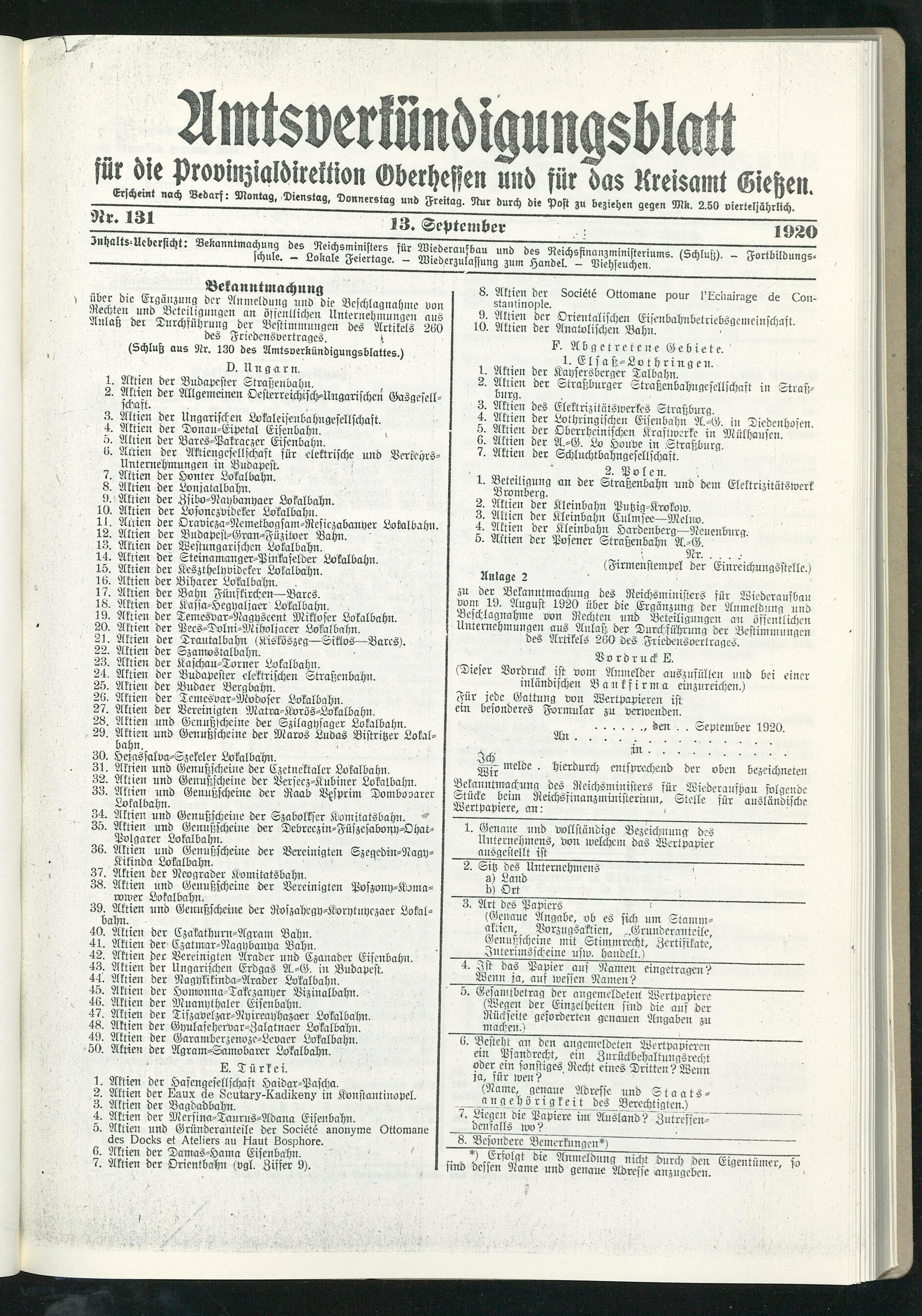 ffA ®e.fm>ttttradnlng des Rnchsministers für Wiederaufbau August 1920 über die Ergänzung der Anmeldung und Beschlagnahme von Rechten und Beteiligungen an öffentlichen Unternehmungen «ns Aulap der Durchführung der Bestimmungen des Artikels 260 des .Friedeiisoertrages.