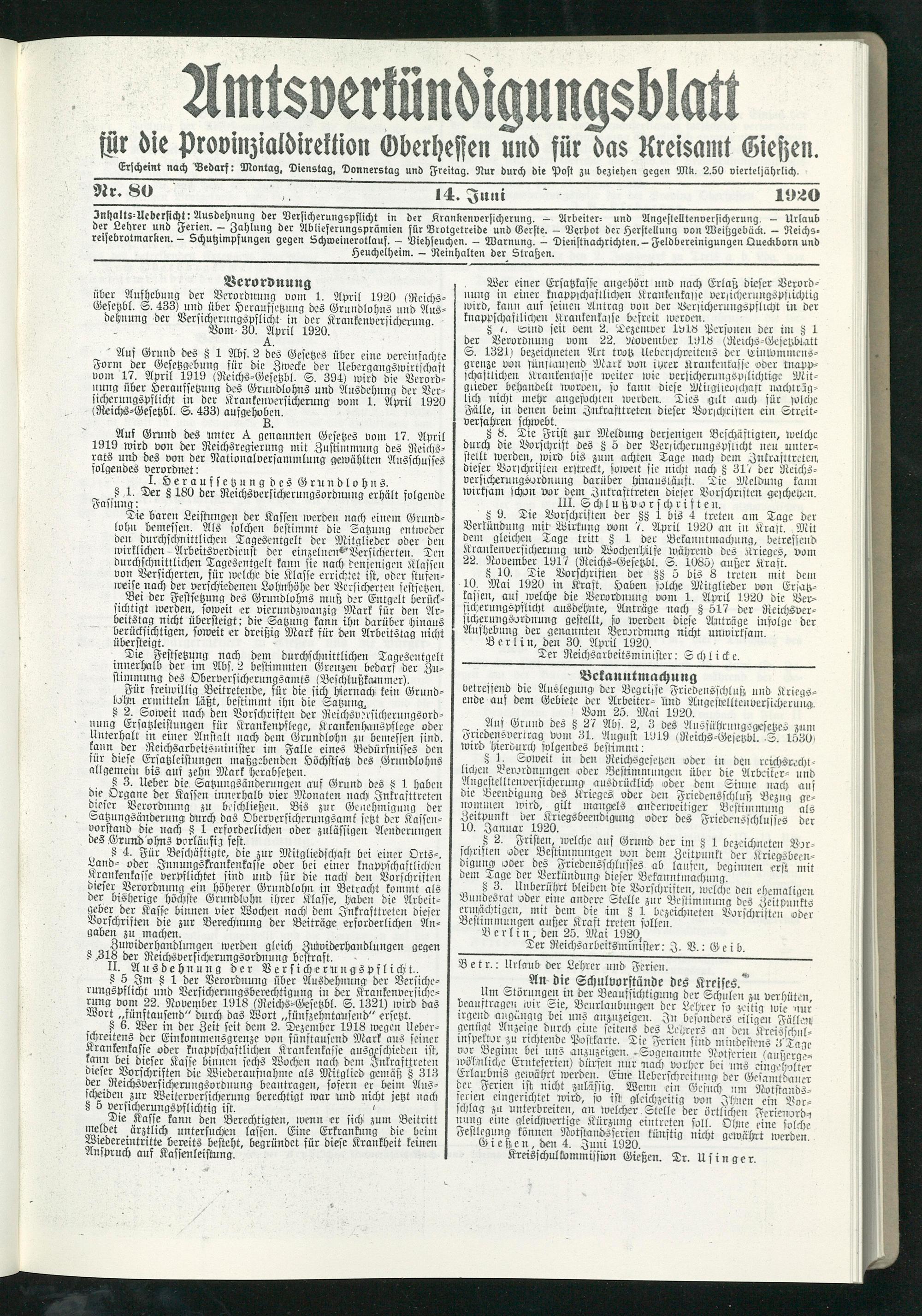 über Aufhebung der Verordnung vom 1. April 1920 (Reichs- Gesetzbl. S. 433) und übet Heraufsetzung des Grundlohns und Ausdehnung der Versicherungspflicht in der Krankenversicherung.