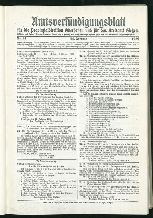 Znhaltr-Uebersicht: Ausnahmezustand Januar 1920. - Sitzung des Provinziallags der Provinz Oberhessen. - Die Ausführung des Grund- erwerbssteuergesetzes. - Fortbildungsschule. — Stiftung der 25. Reserve-Division sowie des Landwehr-Infanterie-Regiments Rr. 118. — Erwerbslosenfürsorge. - Auszahlung der Familienunterstützungen. - Einsendung der Kreisabdeckereiverzeichnisse.