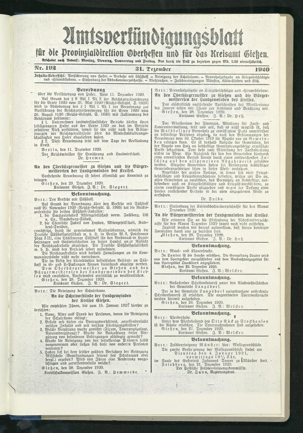 Inhaltz-tkebersicht: Derfütterung von Hafer. — Verkehr mit Süßstoff. — Reinigung der Schulrüume. — Vrennholzabgube an Kriegsbeschädigte tiuft -Hinterbliebene. - Einsendung der Abdeckereiverzeichnisse. - Viehseuchen. - Feldbereinigungen Münster, Klein-Linden und Lich.