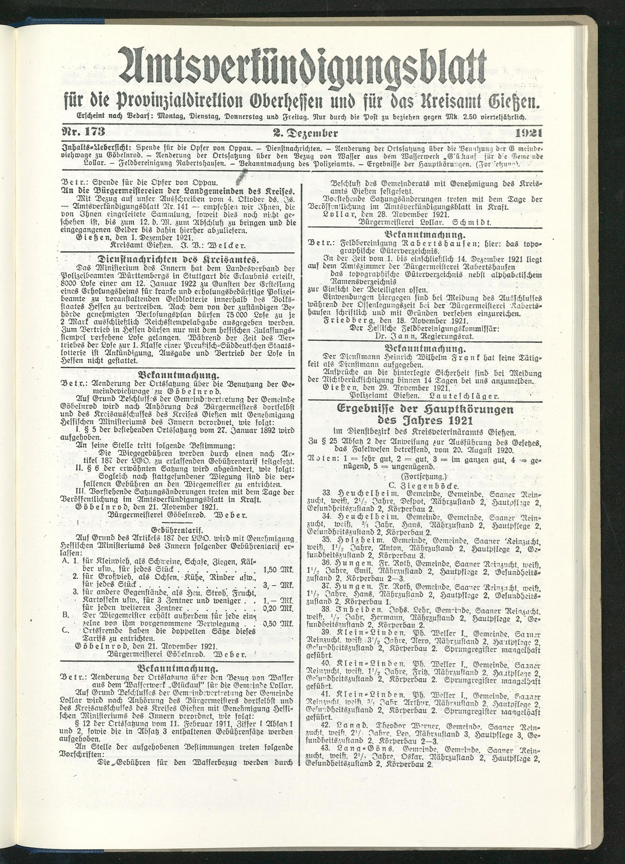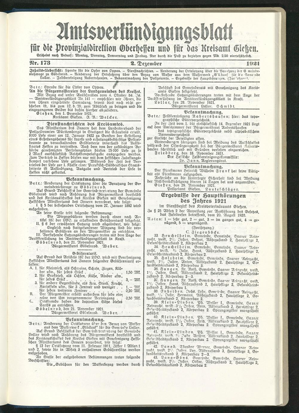 Jnhalts-Aeberficht: Lpende für die Opfer von Oppau. — Dienstnachrichten. — Aenderung der Ortssatzung über die Benutzung der B meinde- oiehwage zu Göbelnrod. — Aenderung der Ortssatzung über den Bezug von Wasser aus dem Wasserwerk „G'ütrans für b e Beine »de Collar. — Feldbereinigung Rabertshausen. — Bekanntmachung des Polizeiamts. — Ergebnisse der Hauptkörungen. (Fvr 'ehuu-V