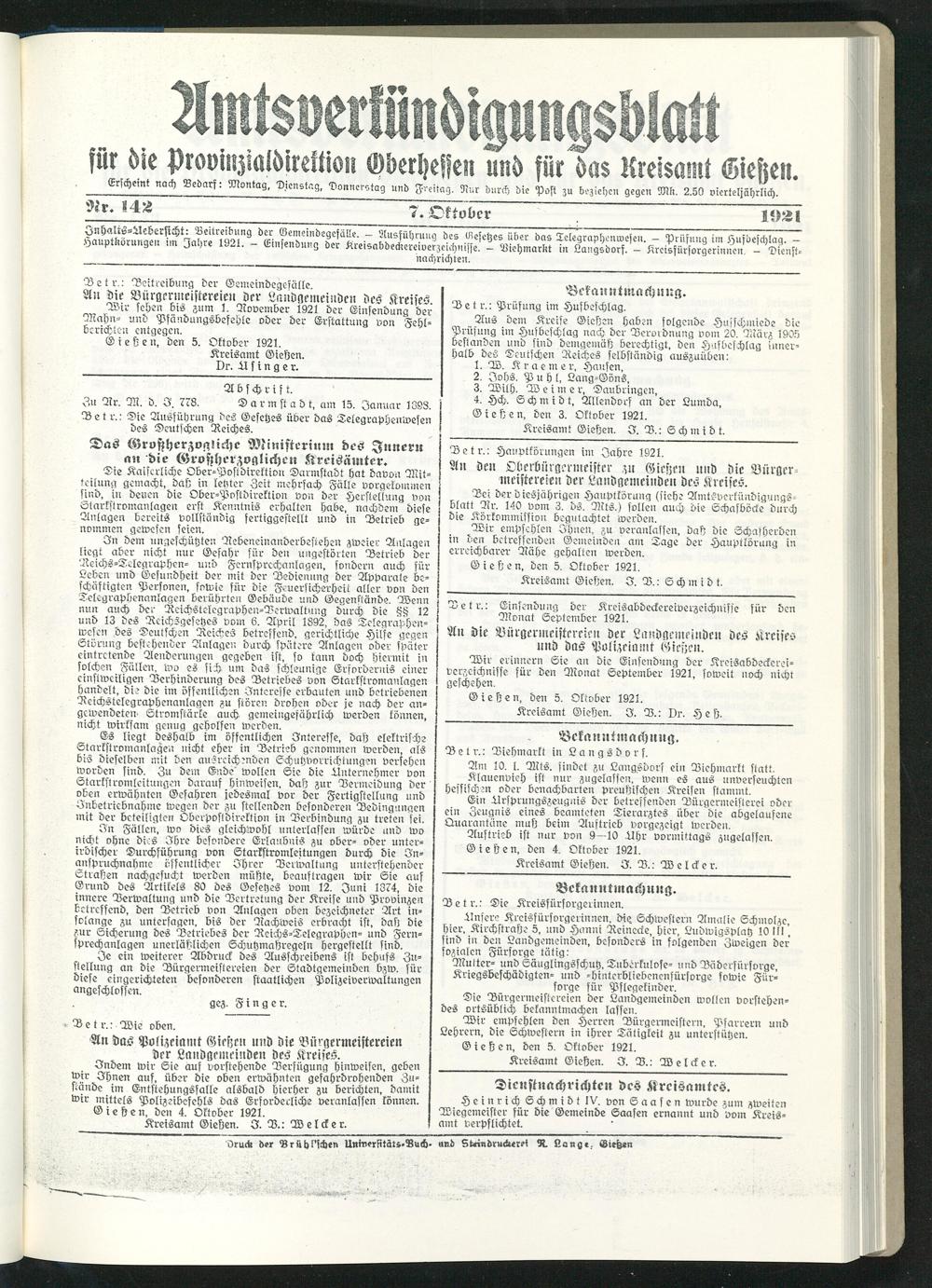 An die Bürgermeistereien der Landgemeinden des Kreises und das Polizeiamt Gießen.