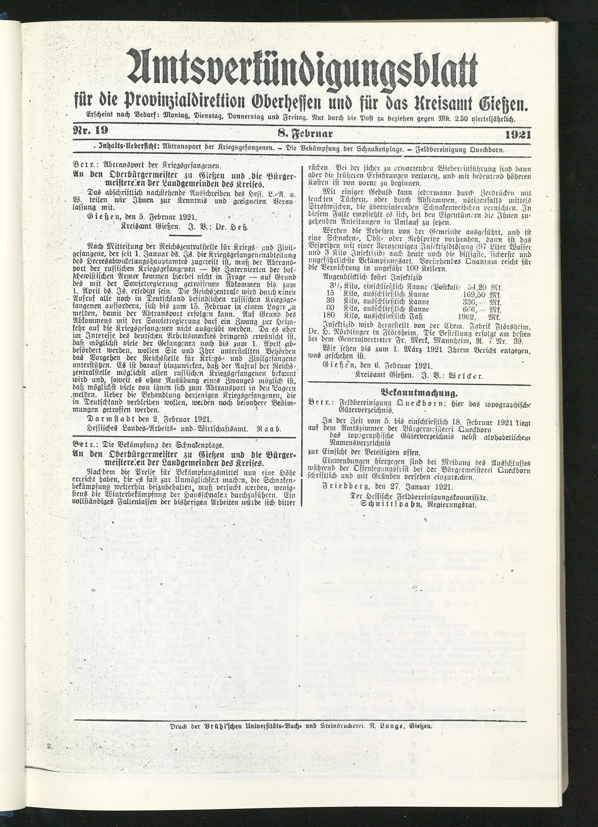 In der Zeit vom 5. bis einschließlich 18. Februar 1921 liegt aus dem Amtszimmer der Bürgermeisterei Queckborn