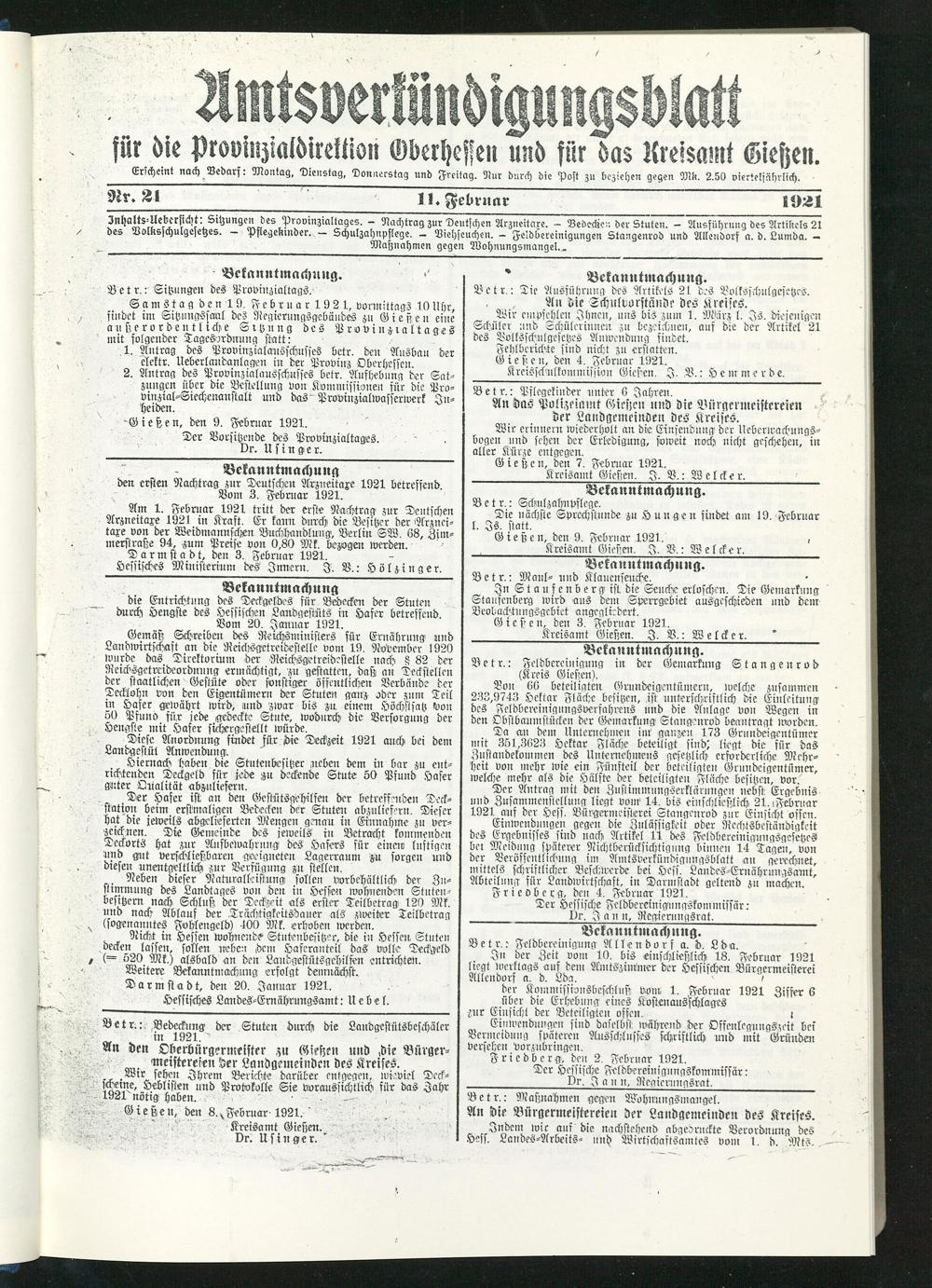 ?"^^Ueberficht: Sitzungen des Provinzialtages. - Nachtrag zur Deutschen Arzneitare. - Bedecken der Stuten. - Ausführung des Artikels 21 bes Dolksjchulgefetzes. — Pflegekinder. — Schulzahnpflege. — Viehseuchen. — Fetdbereinigungen Stangenrod und Allendorf a. d. Lumda. —