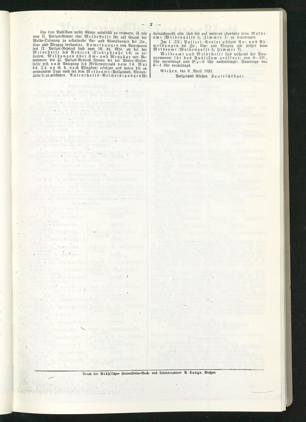 Um dem Publikum weite Gänge möglichst zu ersparen, ist mit dem! II. Polizei-Revier eine Meldestelle für auf Grund der Melde-Ordnung zu erstattende An- und Abmeldungen bei Zu-, Um? und Wegzug verbunden. Anineldungc n von Bewohnern des II. Polizei-Reviers sind vom 18. ds. Mts. an bei der Meldestelle des Reviers (L ieb i g str a ß e 18) zu erstatten. Meldungen üb-er Um- und Wegzüge von Be- ivohnern des II. Polizei-Reviers können bei der Revier-Melde- stellc erst nach Anlegung d.'s Meldematerials vom 18. Mar ds. Js. au (d. h. nach Pfingsten.) erfolgen und haben bis zu genanntem. Tage noch bei dem Meldeamt ! Polizeiamt, Weidengasse 5) zu geschehen. Au f en th a l t s - B e s ch ein i g u n g e nfür