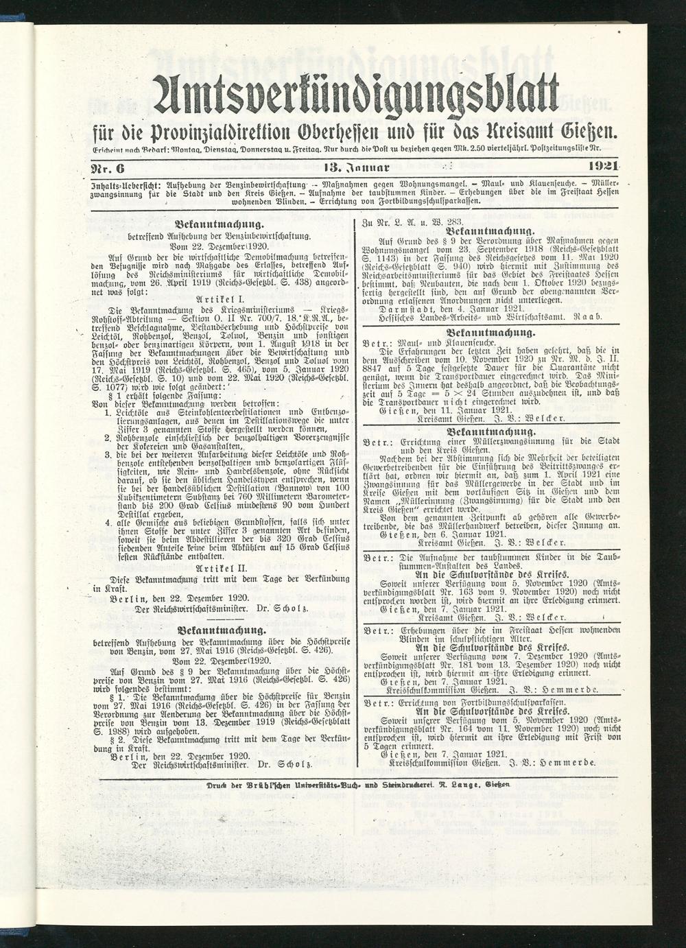 Znhaltr-Ucberficht: Aufhebung der Venzinbewirtschaftung^ — Massnahmen gegen Wohnungsinangel. - Maul- und Klauenseuche. - Miiller- zwangsinnung für die Stadt und den Kreis Giehen. - Aufnahme der taubstummen Kinder. - Erhebungen über die im Freistaat Hessen wohnenden Blinden. - Errichtung von Fortbildungsschulsparkassen.