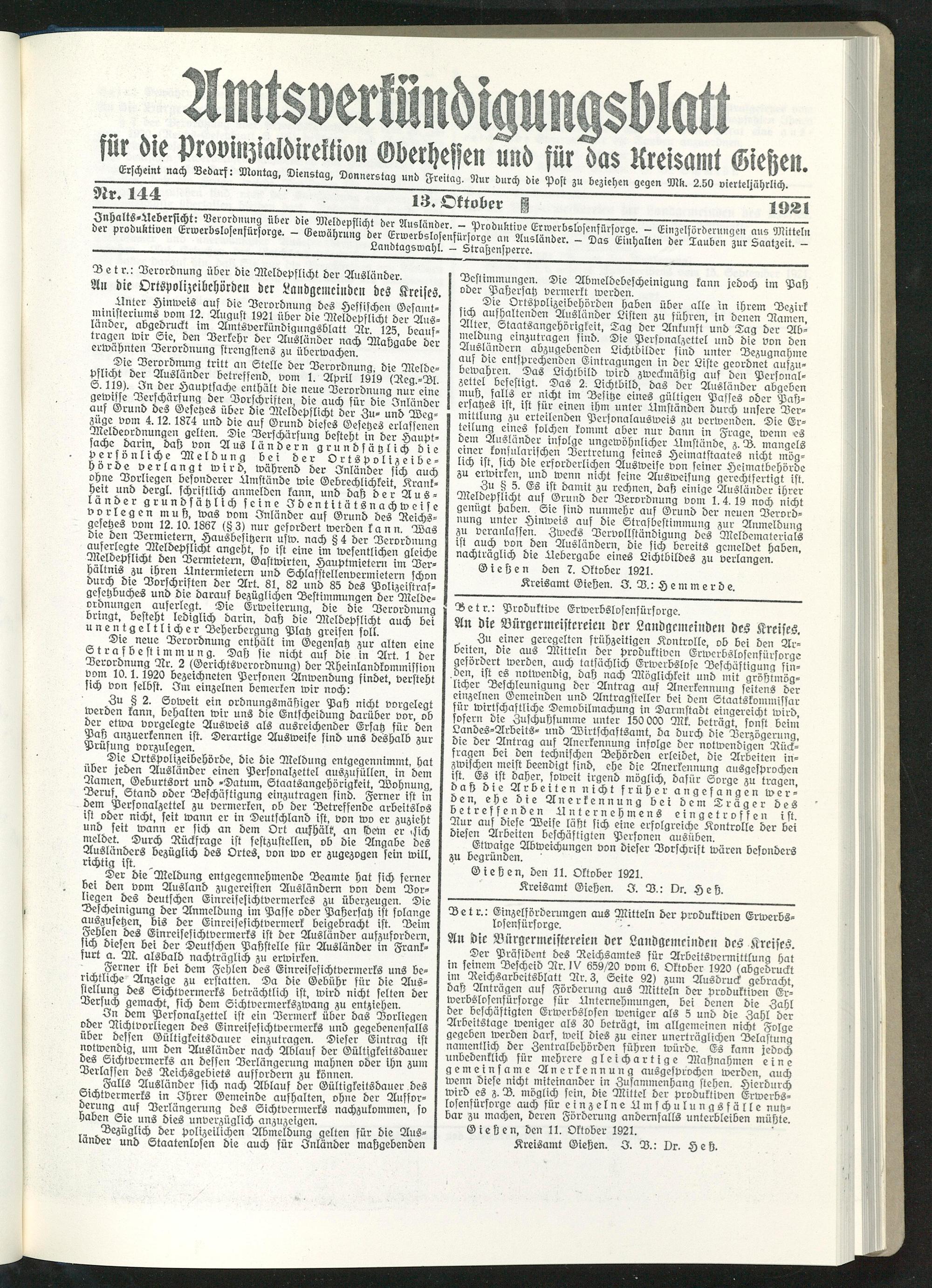 A» die Ortspolizeibehörden der Landgemeindcii des Kreises , Anter Hinweis auf die Verordnung des Hessischen Gesamt-' August 1921 über die Meldepflicht der Aus- “B9^?.rucy E Amtsverkündigungsblatt Rr. 125 beauf- lr.?9”R ,toir r?16, Ben Berkehr der Ausländer nach Maßgabe der erwähnten Verordnung strengstens zu überwachen