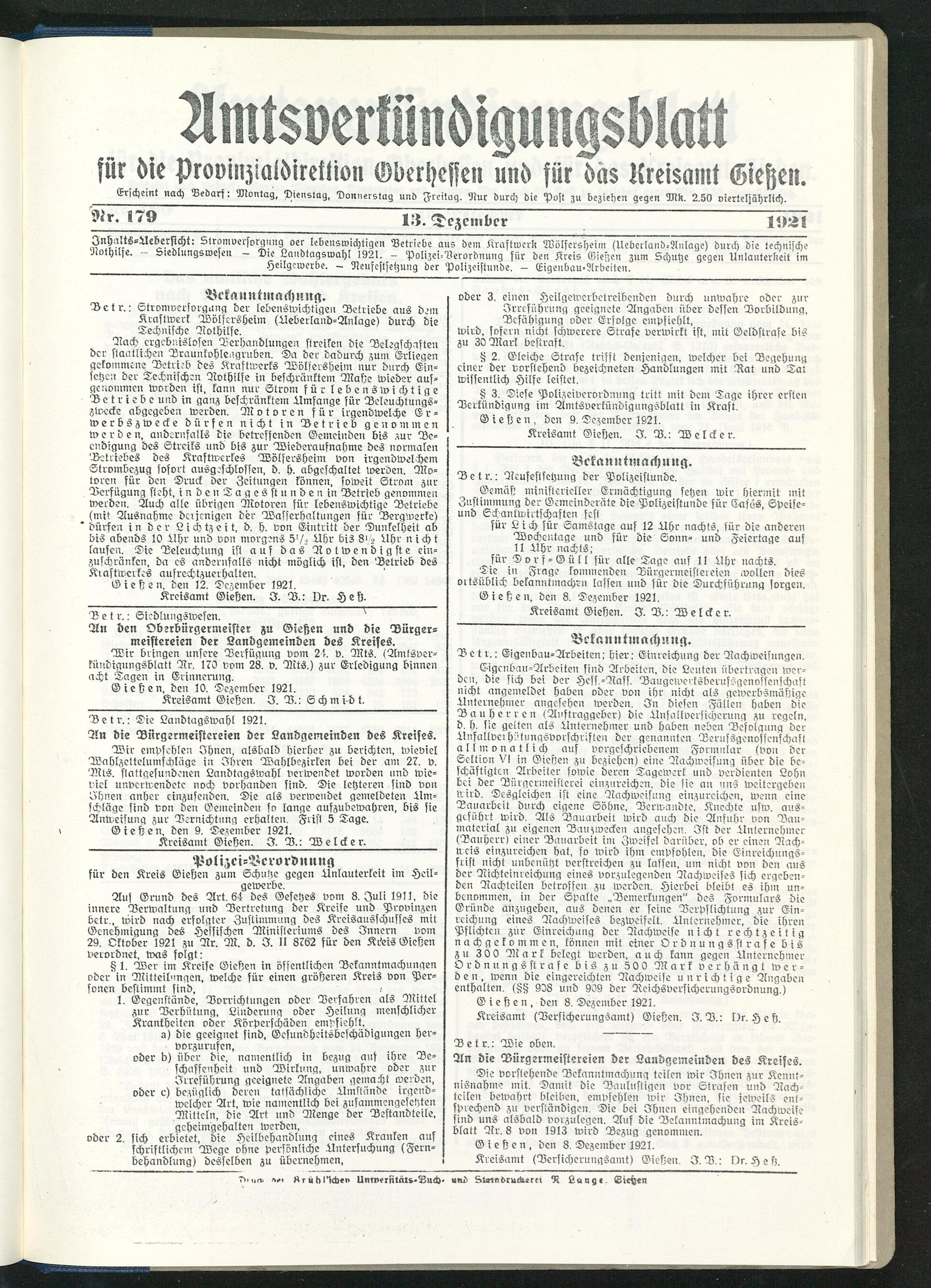 Nothilfe. - Liedlungswessn — Die Landtagswahl 1921. - Polizei-Verordnung für den Kreis Giefzen zum Schutze gegen Unlauterkeit im Heilgswerbe. - Neufestsetzung der Polizeistunde. — Eigenbau-Arbeiten.