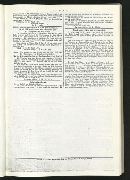 Stand der Maul- und Stau e n s e n ch e i m Kreis Lauterbach am 4. April 1921: Es waren folgende Gemeinden noch Sperrbezirk: Mitzmrod, Hvf-Eisenbach, Bernshaufen, lle.lers.,ausen. Ti: Seuche ijt überall im Erlöschen, abgesehen von Ue.lershau.en. Znm Beo b a ch t un g s g e b ie t gehören folgende Gemeinten: Stadt Lauterbach, Frischborn, Rixf.ld, Rudlos, Schlitz, Nieder Stoll, Pfordt, Hartershausen.