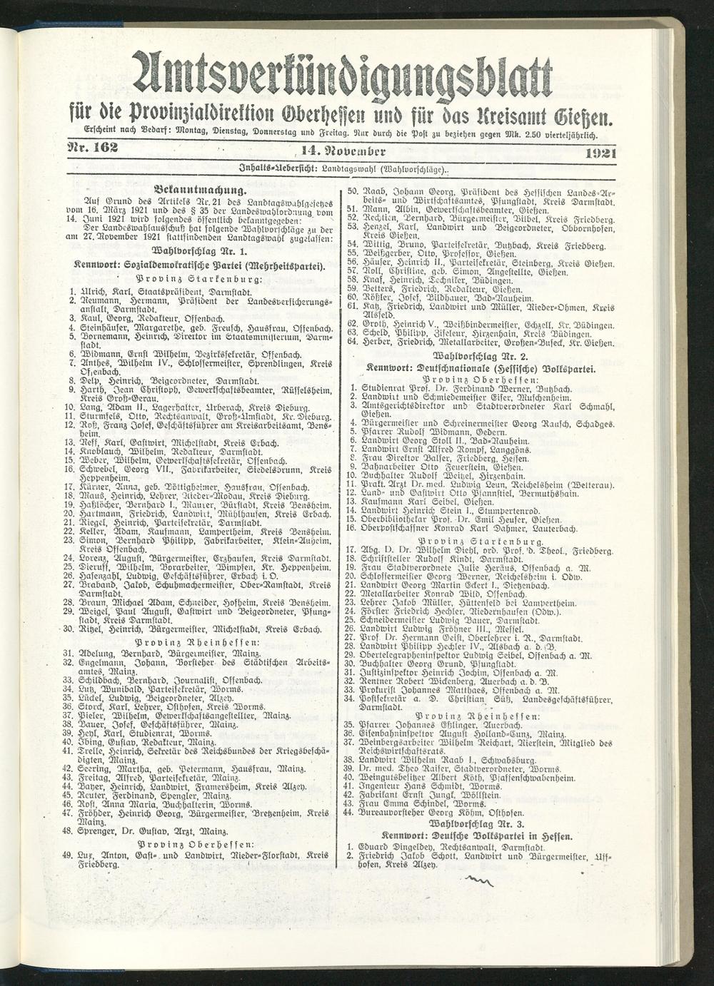 Auf Grund des Artikels Ar.2l des Landtagswahlgesetzes vom 16. März 1921 und des § 35 der Landeswahlordnung vom 14. Juni 1921 wird folgendes öffentlich bekanntgegeben: "