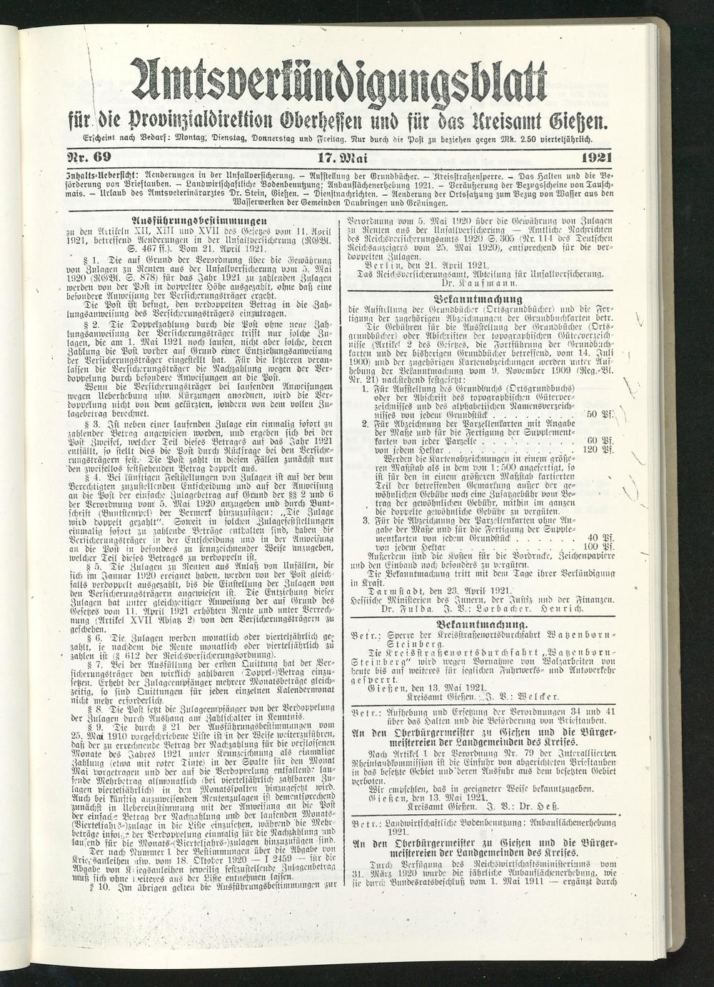 Önhalts-Uebersicht: Aenderungen in der Unfallversicherung. — Tlufstellung der Grundbücher. — 'Kreisstraßensperre. — Das Halten und die Beförderung von Brieftauben. — Landwirtschaftliche Bodeiibenutzung; Anbauflächenerhebung 1921. — Veräußerung der Bezugsscheine von Tauschmais. — Urlaub des Amtsvsterinärarztes Dr. Stein, Gießen. — Dienstnachrichten. — Aenderung der Ortssatzung zum Bezug von Wasser aus den Wasserwerken der Gemeinden Dnubringen und (Brimingen.