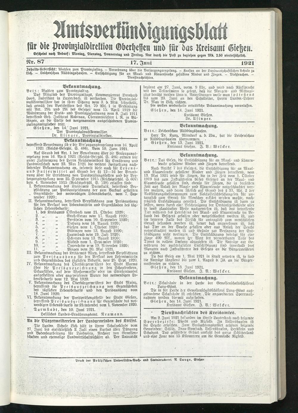 Sie wollen wiederholte ortsübliche Bekanntmachung veranlassen. Gießen, den 14. Juni 1921.